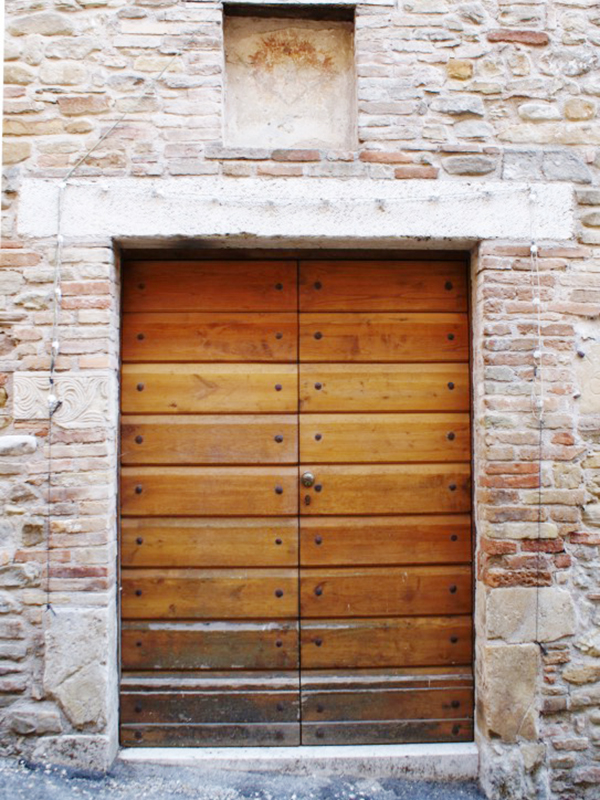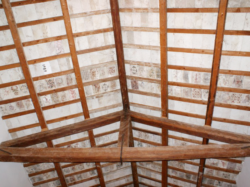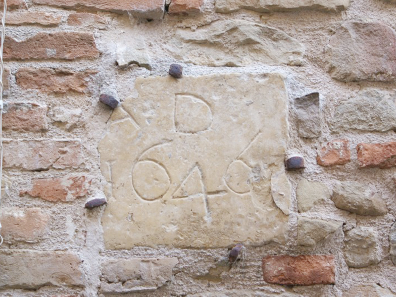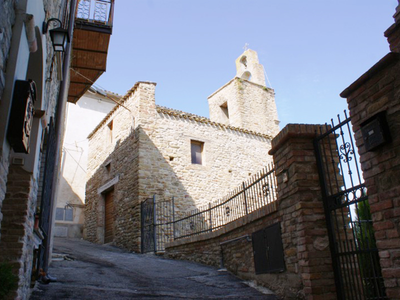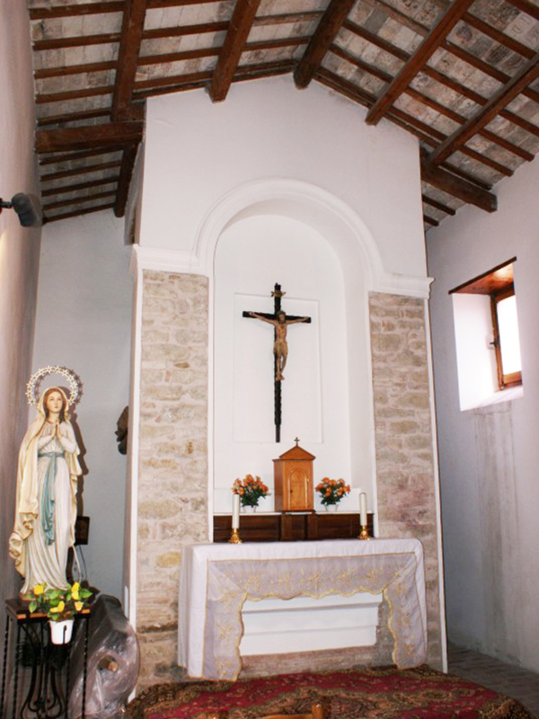 Nello stipite del piccolo portale con architrave piano si trova, rimesso in opera, un concio medievale in pietra con decorazione floreale; di fianco alla porta, anch’esso rimesso in opera, un altro concio reca incisa la data 1646. In corrispondenza della parete posteriore si erge un campanile a vela con due alloggiamenti per le campane, di cui solo uno, il più piccolo, ne ospita una. L’interno è ad aula unica con un bel soffitto in mattonelle, in cui quelle originarie recano policrome figure di animali, fiori e angeli dipinti. Su una mattonella si legge “Questa chiesa / fè fare per sua / devozione don / Alessandro Forcella”. Su altre due mattonelle si leggono le date 1933 e 1989, presumibilmente coincidenti con quelle di due passate ristrutturazioni.