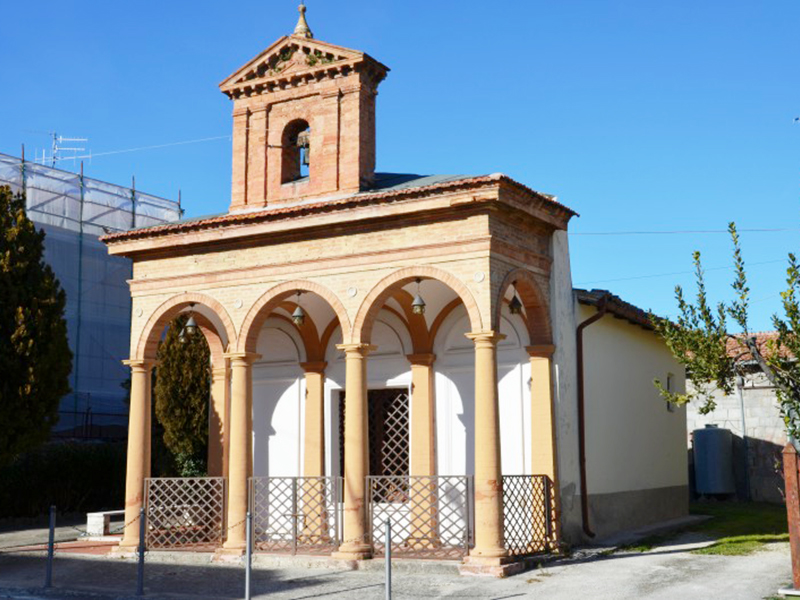 Si tratta di un modesto edificio costruito nel corso dell’Ottocento che ha inglobato una edicola quattrocentesca. La Cappella, cui si accede da una porta laterale semplice e disadorna, ad architrave piano, ha sul lato fronte strada un finestrone; questo lato è preceduto da un portico in aderenza con la facciata che si eleva al di sopra dell’edificio. E’ realizzato in mattoni faccia vista e presenta tre archi sul fronte e due archi laterali, tutti a tutto sesto, retti da colonne rotonde lisce. Su queste poggia una trabeazione con cornicione da cui svetta una campanile a vela rastremato da timpano, anch’esso in mattoni, dove alloggia una piccola campana. L’interno è ad aula unica rettangolare coperta da tetto a due falde sorretto da capriate lignee. Al centro dell’aula è presente un altare in muratura affrescato, appartenuto all’antica edicola, su cui campeggia una Madonna del latte posta in una nicchia circondata da santi e soggetti sacri. La parte retrostante l’altare è sopraelevata di un gradino.