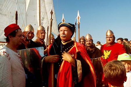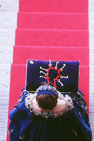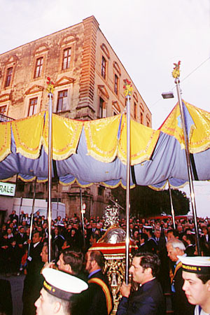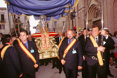 La prima domenica di maggio ed i giorni che immediatamente la precedono, vedono svolgersi l'appuntamento annuale del Perdono di Ortona. Nel 1479, in seguito ad un tentativo di furto sacrilego, perpetrato, sembra, da alcuni avidi mercanti veneziani, la cerimonia di maggio, già di per sè solenne, divenne ancora più imponente per il corteo della consegna delle chiavi. Infatti il governo di Ortona, per scongiurare l'eventualità di un nuovo furto, provvide a conservare le reliquie dietro una chiusura di ferro che, con il succedersi dei secoli venne rafforzata con sette cancelli, le cui chiavi furono suddivise tra le due autorità comunali: tre a quelle civili, quattro a quelle religiose, in modo tale che senza la presenza di entrambi non si potesse accedere alle Sacre Spoglie. Da allora, la vigilia della festa, dalla sede municipale parte un corteo che, preceduto dal gonfalone, si reca presso la cattedrale dove, alla presenza del sindaco e delle autorità a cui sono state affidate le chiavi, si provvede ad esporre alla venerazione dei fedeli le reliquie conservate in un artistico busto d'argento. Oggi la cerimonia del Perdono si è arricchita di una scenografica sfilata di figuranti in costume cinquecentesco e di una cena all'aperto, illuminata da torce e candele, nell'antico quartiere ebreo (v. Giudea) allietato da musiche d'epoca, che tuttavia ha modificato solo gli aspetti esteriori della manifestazione, la quale, nei concetti e nei valori fondamentali, è restata immutata, come esemplare espressione di profonda fede popolare.