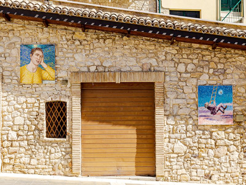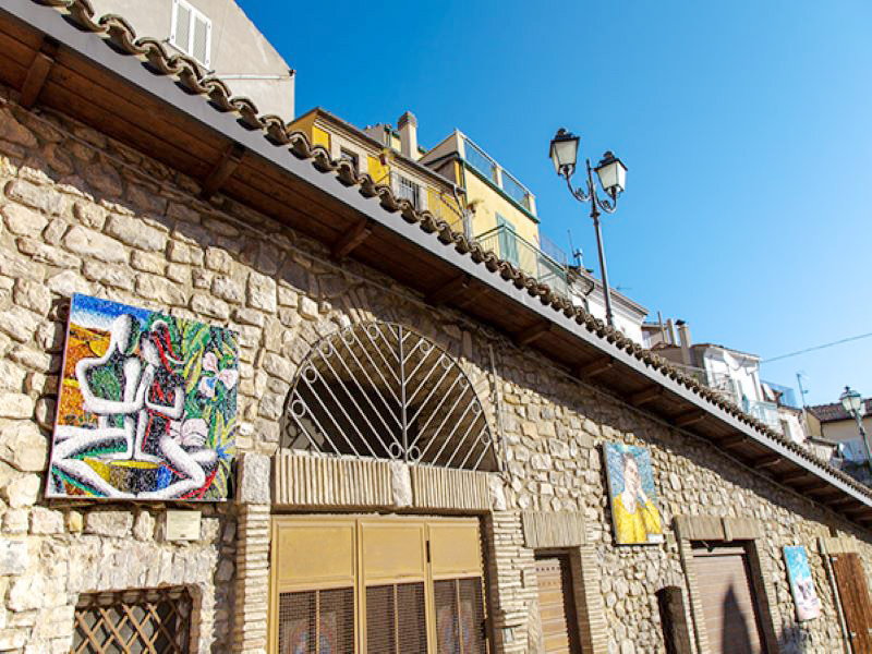 Quella di come un piccolo paese dell’entroterra abruzzese si sia avvicinato all’arte contemporanea è una storia che si indovina passeggiando tra le vie del paese. E’ una storia che ha come protagonista un uomo, uno dei tanti che abbandonata la propria regione d’origine trova fortuna altrove, a Milano. E’ la storia di un mercante e collezionista d’arte, Alfredo Paglione e dei suoi ricordi legati alle proprie origini Abruzzesi. Ricordi pieni di affetto, tanto forti da voler far vivere la propria collezione d’arte nella sua regione, arricchendola negli ultimi anni, grazie alle sue donazioni, di musei e opere d’arte contemporanea. Il suo forte attaccamento alle radici Tornarecciane, ha fatto si che anche questo piccolo paese divenisse un vero centro d’eccellenza per quello che riguarda l’arte contemporanea. Passeggiare per le strade del paese è un’esperienza unica: i 96 mosaici collocati nel centro storico si riempiono di luce, ed è come vederli urlare la propria forza estetica, comunicativa. Perdersi in ogni singolo mosaico vuol dire ascoltare una storia che celebra l’uomo; la sua creatività, la sua manualità ma soprattutto la sua quotidianità. I mosaici realizzati per questo paese sono nati per condividere il vissuto di ogni singolo abitante ed è così che nella provincia italiana, un’intera comunità vive all’interno di un museo che trae energia proprio dalla quotidianità. Passeggiando, quindi si scopre qualcosa di nuovo, qualcosa che sa di bello, di arte e di amore.