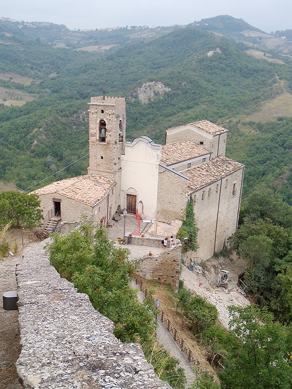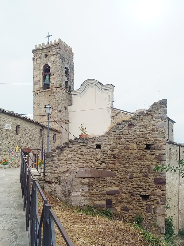 Le prime notizie che documentano l’esistenza della chiesa risalgono al 1568. All’interno dell’edificio sono stati realizzati nel corso dei secoli numerosi altari dedicati a vari santi da famiglie del paese. La facciata della chiesa sorge aperta sul lato desto e chiusa dal campanile sul sinistro. Al centro vi è una parte intonacata e biancheggiata con una terminazione a timpano mistilineo non in asse con il sottostante portaleche introduce alla navata mediana. Sul lato destro una semplice muratura in pietra, priva di aperture e con copertura a falda, lascia percepire la presenza di abitazioni un tempo appoggiate alla chiesa su questo lato. L’elemento esterno di maggior rilievo architettonico è il campanile, il cui ultimo blocco è delimitato da paraste a sezione rettangolare, decorate con capitelli con volute, poste alle estremità di ogni angolo smussato a sostegno di una semplice trabeazione con modanature aggettanti in corrispondenza delle paraste. L’interno presenta una scansione in tre navate con bassi archi a tutto sesto poggiati su pilastri quadrati cui si addossano lesene che si innalzano fino all’imposta di copertura della navata centrale. Le campate delle navate laterali sono coperte con volte a crociera. Il presbiterio, invece, è coperto con una calotta emisferica su pennacchi. La volta della navata centrale presenta soluzioni a crociera decorate con cornici che riproducono riquadri di geometria complessa destinati ad ospitare affreschi. Sulle pareti delle navate si addossano altari con dossali riccamente decorati di chiaro gusto tardo barocco.