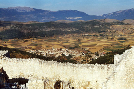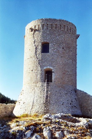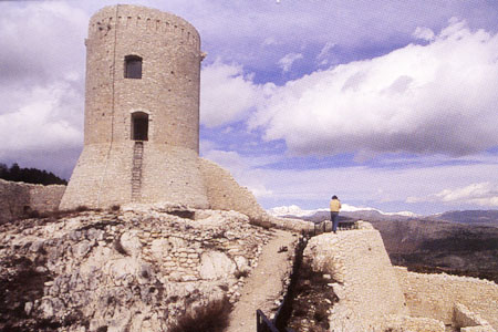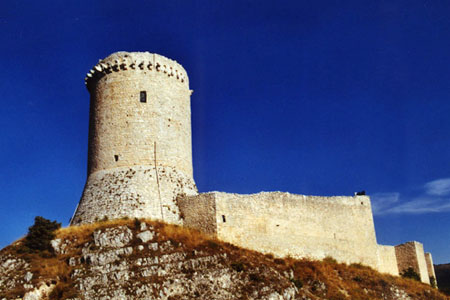 Il castello è costituito da un recinto trapezoidale scandito da torri quadrate e, nel punto in cui il trapezio si restringe, la cinta muraria si conclude con una torre cilindrica con base scarpata e coronamento aggettante che si inserisce nel più ampio sistema di comunicazioni visive con le altre fortificazioni presenti sul territorio. La struttura delle mura è realizzata a sacco con pietre di piccola pezzatura; la stessa tecnica costruttiva caratterizza la torre tonda che si eleva, senza rastremazioni, per tre piani di eguale altezza. Singolare è l'assenza di struttura di collegamento verticale che fa supporre un accesso ai piani superiori per mezzo di scale retrattili. L'inedito accostamento della torre con il recinto intervallato da torri quadrate, fu realizzato presumibilmente nella prima metà del XV secolo dopo la spedizione di Braccio da Montone del 1424 e forse sull'idea di Cipriano di Iacobuccio da Forfora, ricco possidente aquilano, feudatario di Bominaco, secondo uno schema che appare antiquato rispetto ai progressi dell'architettura difensiva del '400.