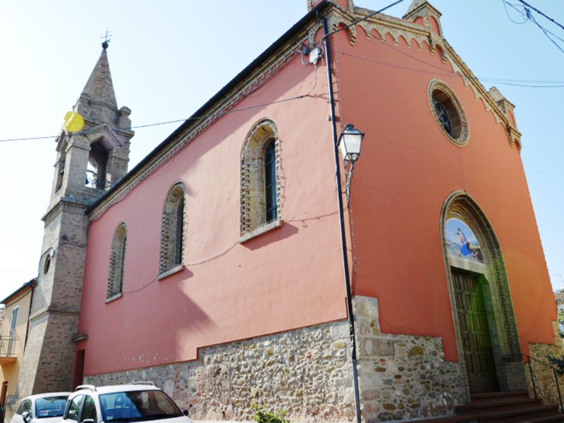 E’ un edificio con copertura a capanna il cui basamento, lasciato senza intonaco, rivela un muratura realizzata in ciottoli di fiume, che da parte degli studiosi lo fa datare a cavallo tra il Cinquecento ed il Seicento. Sulla facciata, abbellita da tre pinnacoli in corrispondenza del tetto, si aprono un portale ad arco ogivale incorniciato in laterizio e, più in alto, un finestrone rotondo, anch’esso incorniciato in laterizio. Alla parete posteriore è poggiata una torre campanaria a base quadrata con muro a scarpa realizzata nel 1931, in occasione di un importante restauro della chiesa.