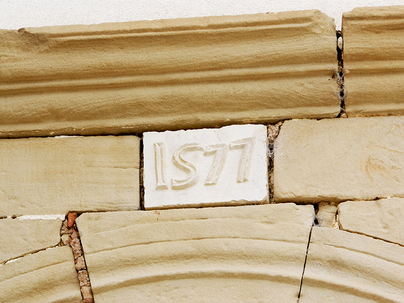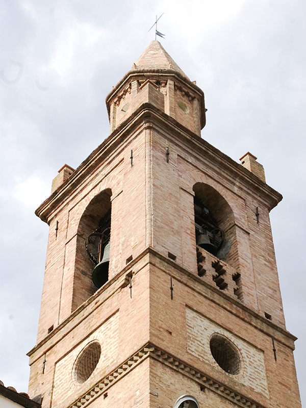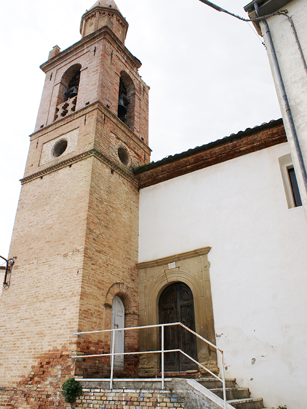Restaurata verso la fine degli anni sessanta del secolo scorso, presenta un basso portale incorniciato da laterizio che consente l’ingresso in chiesa lateralmente. Di fianco all’ingresso della chiesa c’è la casa parrocchiale, dove è bene in vista un grande fregio dorico in pietra con raffigurazione di armi, utilizzato come architrave, (peraltro posizionato a rovescio), la cui datazione risale intorno al I secolo A.C. Questa è da ritenersi la testimonianza di un antico insediamento romanico sviluppatori probabilmente intorno alla ormai inesistente chiesetta di S.Maria ad Balneum posta a circa 1 Km. dall’attuale centro abitato. Un basso passaggio a volta consente poi l’accesso al retro della chiesa, dove si raggiunge la torre campanaria in laterizio che ospita due campane. Qui si individua un altro accesso alla chiesa tramite un portale in arenaria con rosette di decoro sui pilastrini laterali, sulla cui parte superiore si legge la data 1577.