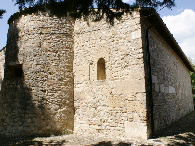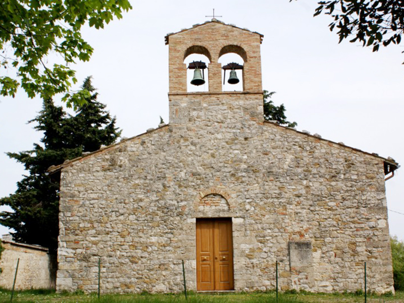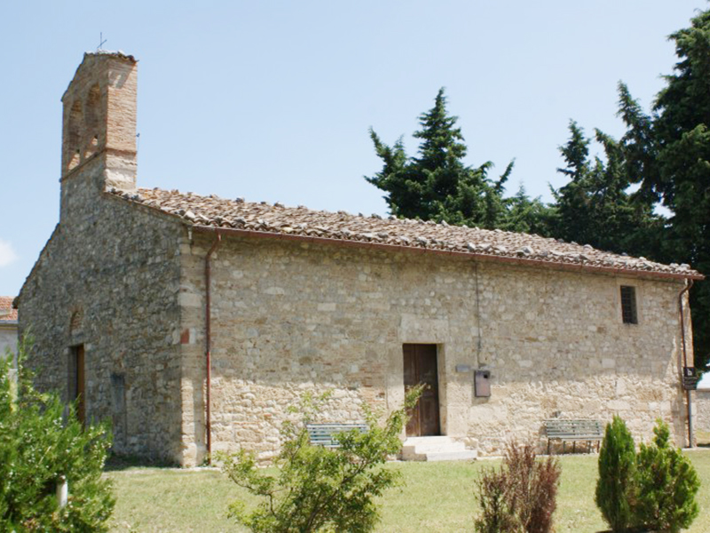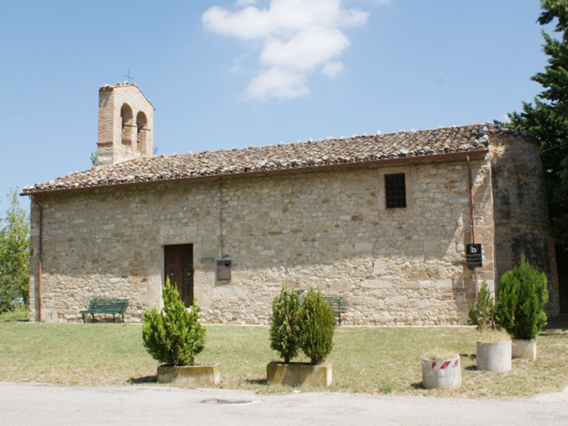 Il suo nome vuol dire “di campagna”, “in mezzo ai campi”, giacché in latino praedium vuol dire podere, fondo. Si presenta in un semplice e lineare stile romanico con tetto a capanna, abside e campanile a vela in linea con la facciata. Il grande ambiente interno è suddiviso in tre piccole navate. Si tratta di una delle più antiche chiese della provincia di Teramo e la sua costruzione viene fatta risalire al X – XI secolo. Vennero probabilmente riutilizzati materiali provenienti da varie costruzioni preesistenti, in particolare da un castello medievale, ora scomparso, che sovrastava la frazione di Pantaneto. All’interno sono ancora visibili i resti di alcuni pregevoli affreschi, come una Madonna con Bambino del settecento ed un San Sebastiano di fine cinquecento. La chiesa viene citata in documenti ufficiali per la prima volta in una bolla papale di Anastasio IV del 1153. L’edificio, che deve il suo aspetto attuale ad un importante restauro avvenuto nel 1592, ha subito nel tempo numerosi altri interventi conservativi, purtroppo talvolta particolarmente invasivi; l’ultimo risale al 1977, quando fu rifatto anche il tetto.