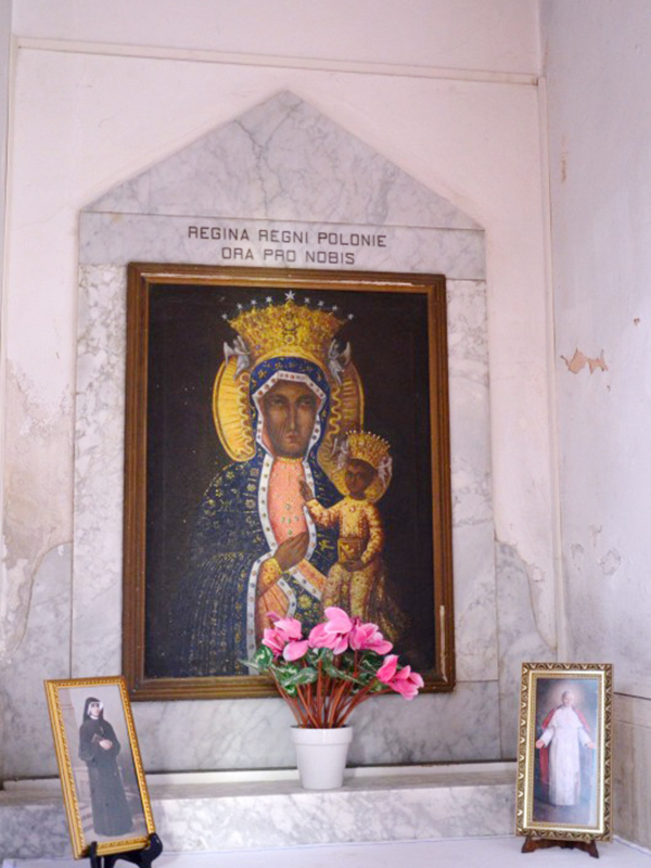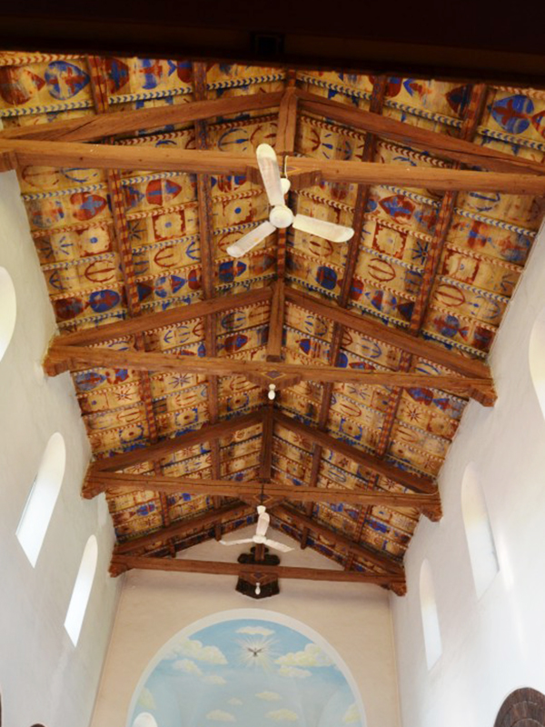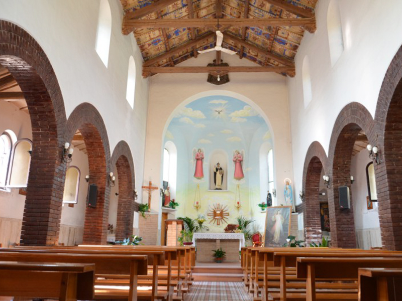 A copertura a capanna, la sua facciata è completamente in mattoni rossi. Il portale d’ingresso, sormontato da una tettoia in legno, è ad architrave piano ed è sormontato da una grande finestra rotonda. L’interno è costituito da una navata centrale che termina nel presbiterio e due piccole navate laterali, ciascuna separata dalla nave centrale da tre archi a tutto sesto incorniciati in laterizio. Il presbiterio è collocato nell’abside, che ha la forma di metà esagono, è sopraelevato di due gradini dal resto della chiesa e ne è separato da un arcone a tutto sesto. Sulla sommità dell’arcone è lo stemma gentilizio del Vescovo di Teramo Mons. Vincenzo Micozzi. Questi fu vescovo dal 1927 al 1944, e la data 1937 sullo stemma si riferisce presumibilmente alla data di consacrazione della chiesa. La navatina di destra ha un’edicola votiva dedicata alla Madonna, invocata come “Regina del Regno di Polonia”, donata, come riferitoci da un’attenta cittadina, da una comunità di polacchi come ringraziamento alla comunità di Garrufo per la generosa ed affettuosa ospitalità ricevuta durante la Seconda Guerra Mondiale. La copertura, sorretta da capriate a vista, è in mattoni dipinti con motivi allegorici e floreali.
