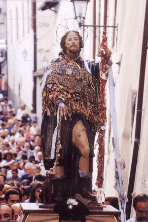Dopo Sant'Antonio Abate il Santo più popolare è San Rocco protettore della peste e delle epidemie in genere. In Abruzzo, come del resto in quasi tutta l'Italia, molti sono i paesi che il 16 agosto ne celebrano la ricorrenza della morte. Anche Castelvecchio Subequo celebra la ricorrenza di San Rocco, con una festa che, per molti aspetti, si distingue dalle numerose altre che si svolgono nella regione. Essa viene gestita direttamente da una famiglia che è depositaria non solo del tesoro del Santo, ma anche in un certo senso, delle qualità taumaturgiche legate alla sua figura. Da tempo immemorabile i discendenti maschi della famiglia Santini sono i possessori di alcune antiche immagini del Santo che, fino a pochi anni fa, venivano prestate ai malati del paese, o anche a quanti trovandosi in difficoltà materiali o spirituali ne facessero richiesta. A grazia ricevuta il quadro veniva restituito unitamente ad un ex voto, solitamente consistente in un oggetto d'oro, che il capo famiglia dei Santini provvedeva ad aggiungere al cospicuo tesoro del Santo, la cui statua era conservata in una antica chiesa campestre ove restano ancora interessanti affreschi di fattura popolare. Oggi il simulacro è collocato in una cappella laterale della parrocchia e, in occasione della festa, la famiglia Santini provvede a vestirlo con grandi fasce di seta su cui sono cuciti gli oggetti preziosi.