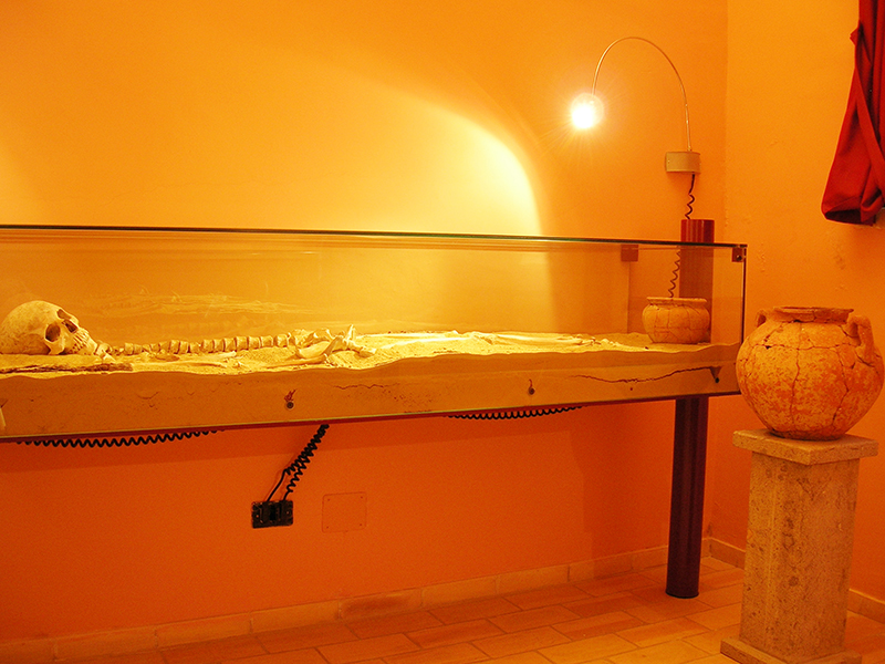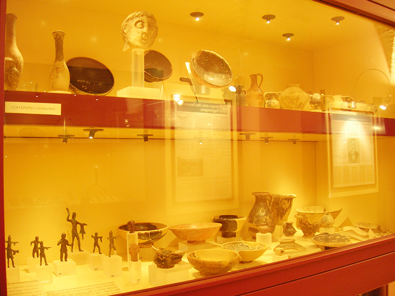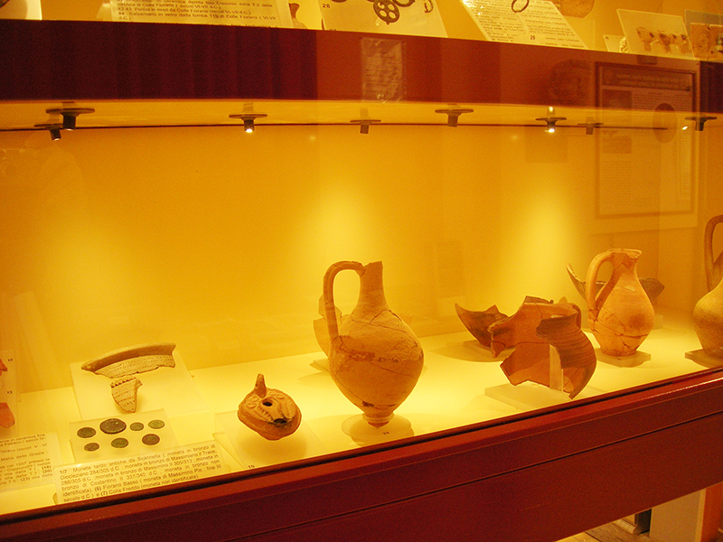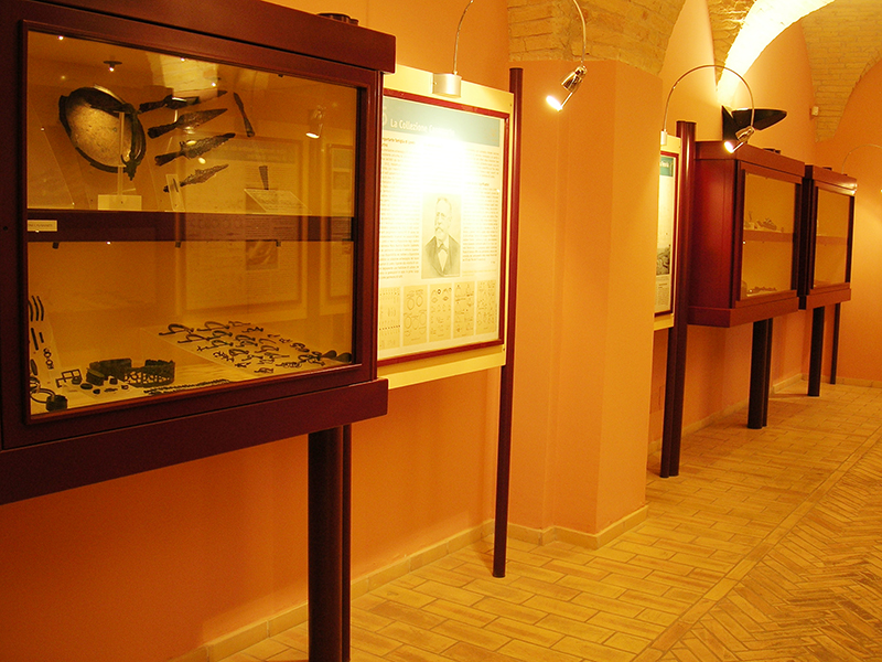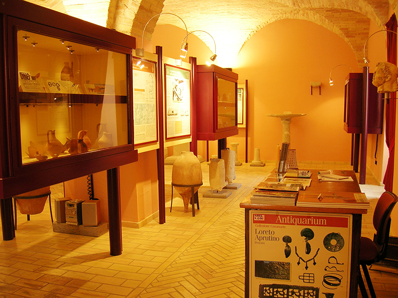 L'Antiquarium presenta una panoramica della presenza umana sul territorio di Loreto Aprutino a cominciare dal Paleolitico con un raschiatoio in selce ritrovato sulle sponde del Fiume Tavo. Corredi tombali, armi, vasellame, gioielli, oggetti cultuali, scavati nelle necropoli di Fiorano, Scannella Superiore, contrada Cappuccini e Madonna delle Grazie testimoniano come i Vestini, tra il VII e il V secolo a. C. avessero raggiunto un livello di vita raffinato. Appartengono al periodo romano numerosi materiali, fra cui i resti del Santuario di Feronia a Poggio Ragone, con oggetti della stipe votiva, un altare, una statuetta di Giove e soprattutto i frammenti in bronzo della statua di culto della dea. Di epoca imperiale sono le testimonianze delle ville rustiche sparse sul territorio: mosaici, intonaci policromi, colonne di buona fattura, vasellame d'importazione, oggetti d'uso quotidiano. Particolarmente interessanti i materiali dallo scavo della basilica paleocristiana di S. Serotino, su Colle Fiorano, fra i quali ceramiche altomedievali tipo Crecchio e pettini in osso lavorato.