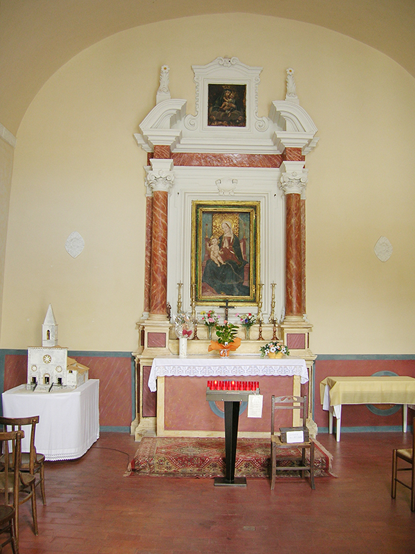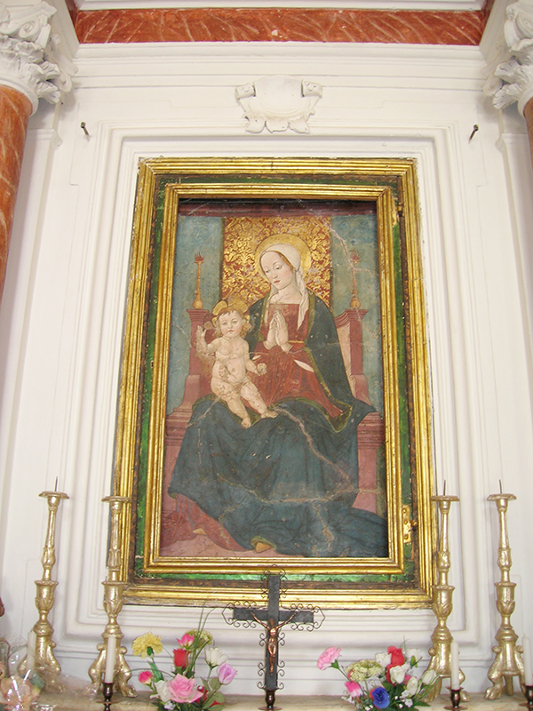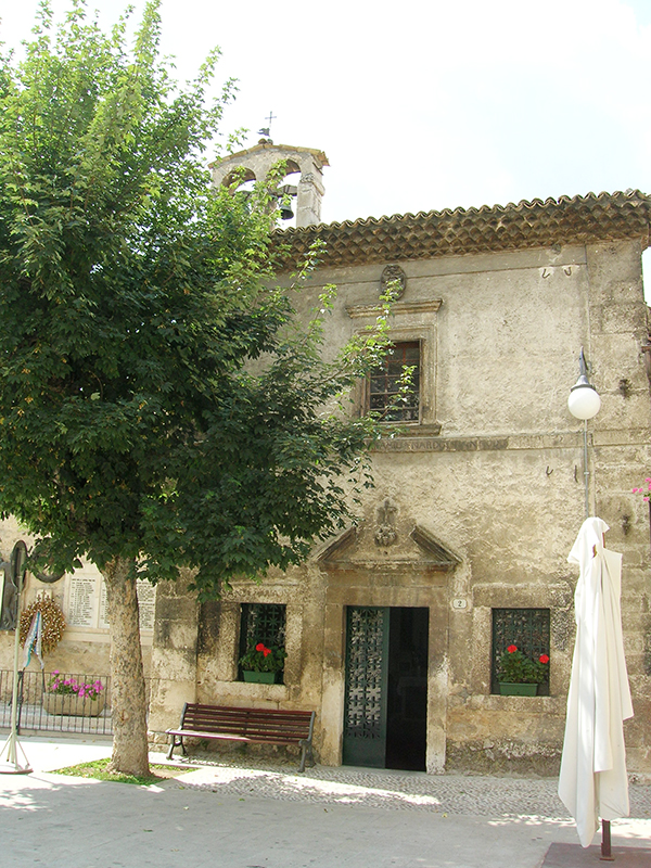 Situata in piazza San Rocco, esisteva già prima del 1418, come testimonia l’affresco dipinto sull’altare che presenta, in una lista rossa sul lato posteriore la scritta: DE CIOLIS +A.D. 1418. Il dipinto, opera di buon rilievo artistico, rappresenta la Madonna in trono con Bambino esaltato da un fondo che imita una stoffa rossa con fiorami d’oro. Il colore delle carni, le mani giunte affusolate, la delicatezza della tecnica e del disegno, sembrerebbero richiamare l’arte senese del ‘400. La chiesa, ad aula rettangolare coperta con volta a botte, subì un riadattamento a cura dei proprietari nel 1708, forse a causa del terremoto, secondo l’iscrizione leggibile sulla facciata: IOHANNES ET MARINUS DE FAMILIA NARTOTY ANNO 1708. La facciata rettangolare rispetta lo schema locale a due campi sovrapposti divisi da una cornice marcapiano e serrati da paraste angolari in pietra squadrata che spiccano dall’intonaco che copre l’intera superficie. L’ingresso mostra un semplice portale in conci di pietra squadrata ed è sormontato da un frontone spezzato, mentre ai suoi lati due finestre rettangolari riprendono i motivi del portale. Il finestrone mediano nell’ordine superiore mostra invece una composizione in elementi ingentiliti da modanature scanalate ed è sovrastato da uno stemma.