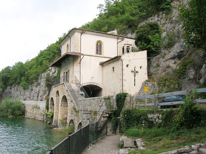 Lungo la S.R. 479 Sannitica sulla sponda sud del lago di Scanno, in una posizione di grande suggestione ambientale, è posta la piccola chiesa di Santa Maria dell’Annunziata, meglio conosciuta come Madonna del Lago. Consacrata nel 1702 in onore della Santissima Annunziata, la chiesetta del lago in origine aveva l’ingresso sulla facciata occidentale, posta verso Villalago, con un armonioso piccolo portico a 5 archi al quale si accedeva da una scalinata ricavata nella viva roccia. Durante i lavori compiute nel 1870-71, per la costruzione della strada rotabile, si dovette però abbattere il portico e spostare l’ingresso sulla facciata prospiciente il lago. La chiesa impostata su un impianto quadrato ad angoli smussati coperto da una cupoletta ribassata non denunciata all’esterno, e presenta tre facciate libere finite a intonaco con aperture in pietra da taglio e cantonali in pietra; il retro è addossato alla parete di roccia. Attiguo alla chiesetta, sul prospetto destro, vi è un piccolo vano un tempo destinato a romitorio. L’interno subì vari restauri all’inizio del secolo: nel 1903 l’altare primitivo venne sostituito con l’attuale in marmo. Le decorazioni alle pareti sono opera degli artisti scannesi. La graziosa tettoia esterna in metallo e il pavimento furono offerti dagli scannesi residenti nel nord America.