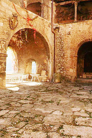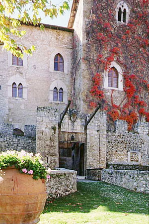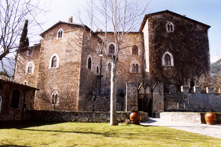 Assediato ed espugnato nel 1462 da Jacopo Fortebraccio, presenta numerose rivisitazioni stilistiche che ne lasciano comprendere l'evoluzione architettonica da struttura difensiva a dimora gentilizia. A pianta quadrilatera e protetto da una doppia cinta di mura, l'imponente impianto medievale è salvaguardato da un ampio fossato controllato da torrioni d'angolo. Vi si entra percorrendo il ponte levatoio e superando un portale archiacuto. La corte è dominata da una forte colonna che sostiene la copertura dello scalone d'accesso al livello superiore ed impreziosita dagli stemmi araldici delle famiglie Colonna, Barberini, Sciarpa e Lazzaroni. Sul lato sud si apre il panoramico loggiato a duplice ordine. Di qui si accede alla cappella gentilizia che conserva due bassorilievi marmorei cinquecenteschi.