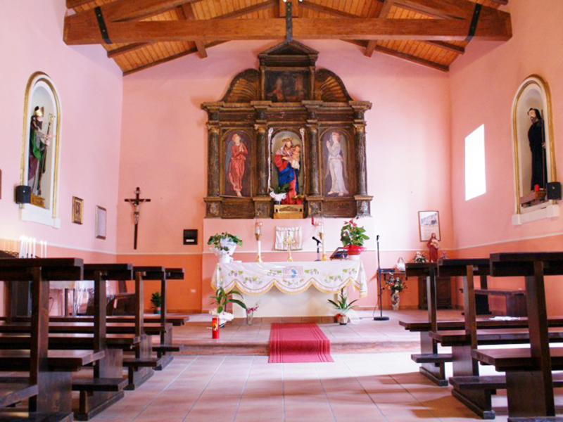 L’edificio originario, già intitolato a San Martino, ha mura perimetrali parzialmente a scarpa ed è databile intorno al 1700. Oggi si presenta, dopo un’attenta ristrutturazione ultimata nel 2008, in pietra a vista legata con malta; il tetto è a capanna e da esso si erge un piccolo campanile a vela che ospita una campana. La semplice facciata guarda insolitamente verso i monti, anziché verso lo slargo che costituisce la piazzetta del borgo, tanto che quello che dovrebbe essere il portale d’ingresso si presenta logoro, vetusto e privo da tempo di manutenzione. Sulla piazzetta si affaccia invece la parete laterale della chiesa nella quale si aprono una piccola porta laterale e due finestroni. L’interno è a navata unica priva di abside e nella zona presbiteriale è collocato quel che resta di un altare barocco in legno con dorature. Al centro è posta una statua della Madonna con Bambino, mentre nelle sue due edicole laterali sono due dipinti raffiguranti due angeli. Nelle due nicchie che si trovano sulle pareti lunghe della chiesa sono posizionate le statue di San Martino e di Sant’Antonio Abate. In prossimità dell'ingresso è incastonata al muro un'acquasantiera in pietra lavorata.