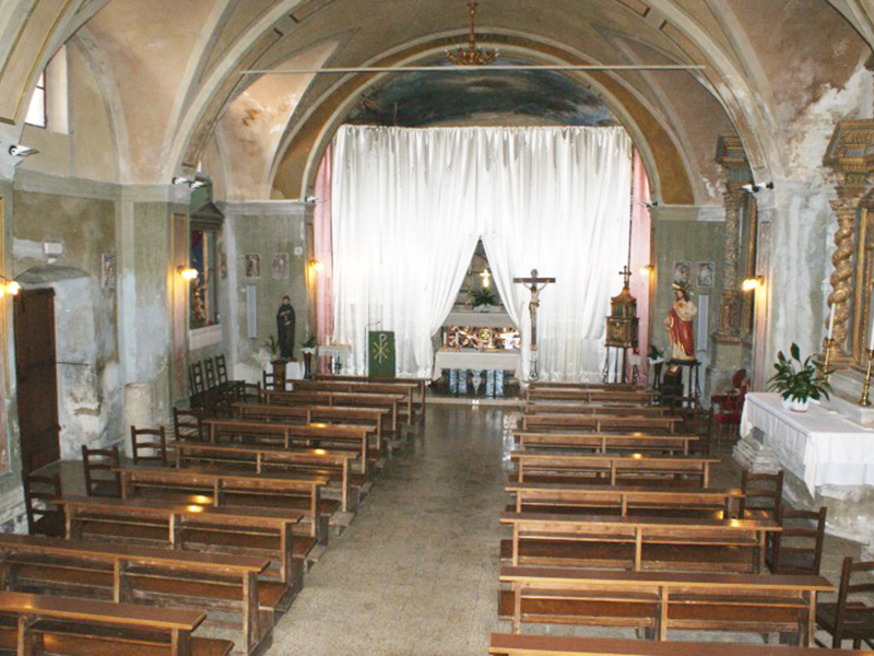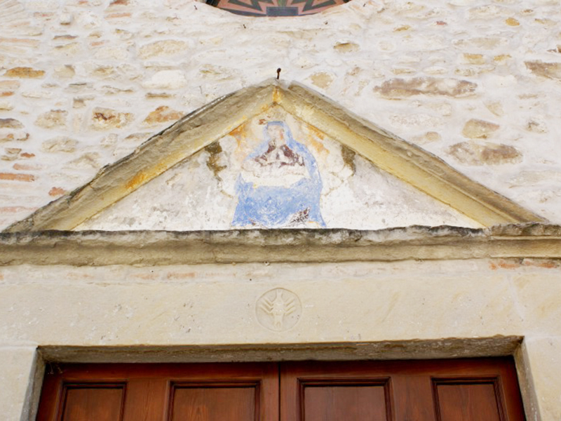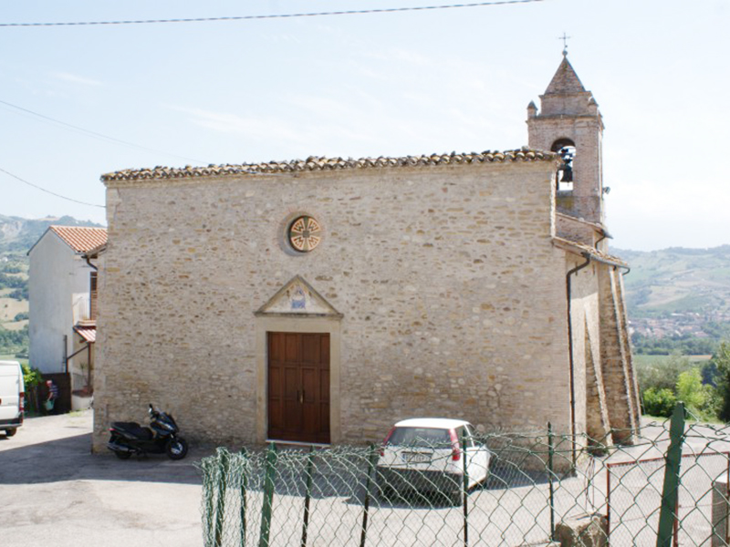 Sulla chiave d’arco del suo portale è presente lo stemma dei Salvatore recante un leone rampante con una stella sopra la testa. Anche la chiesa si presenta nel suo assetto cinquecentesco, anche se la costruzione originaria risalirebbe al 1348. La copertura è a capanna e la sua facciata a coronamento orizzontale con il portale sormontato da un timpano al centro del quale è ancora visibile un affresco raffigurante una Madonna. Le fiancate sono rinforzate da contrafforti ed alla parete posteriore è poggiato un campanile a guglia che sorregge due campane. Appena sopra l’architrave dell’ingresso laterale una mattonella, oggi travisata da una recente pitturazione, reca la data 1568. All’interno, per accedere all’unica navata, è necessario scendere una decina di gradini; il soffitto è a volta ed è sorretto da cinque arconi. La zona presbiteriale è collocata nell’abside e presenta il soffitto affrescato. I due altari laterali sono barocchi ed hanno le classiche colonne tortili in legno dipinto: quello di destra è dedicato a S.Antonio e quello di sinistra alla Madonna del Rosario. Sopra l’altare maggiore c’è una statua lignea di Madonna con Bambino, la stessa raffigurata nel timpano del portale.