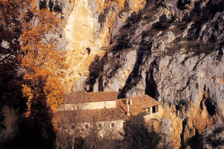 Nella valle del fiume Aterno, a strapiombo su una parete rocciosa, sorge l'Eremo di San Venanzio. All'interno della chiesa si apre una botola da cui parte la Scala Santa, una lunga serie di gradini scavati nella roccia che scende in una grotta sottostante l'antica cella nella quale il Santo, proveniente da Camerino, trascorse in preghiera la sua vita eremitica. A San Venanzio si attribuiscono eventi miracolosi collegati all'acqua; egli infatti avrebbe fatto sgorgare sorgenti dalle rocce ed il suo corpo si sarebbe impresso sulle rocce stesse ammollandole. Lungo il sentiero che parte dall'Eremo e nel rifugio del Santo si rinvengono le impronte del suo passaggio e del suo sostare; il giaciglio conserva le tracce del corpo disteso, altre pietre mostrano la forma del piede, di una mano, di un gomito e così via. Questa particolarità ha conferito al Santo qualità taumaturgiche rigenerative alle quali si ricorre con pratiche litoterapiche. Egli, infatti, dona figli alle coppie sterili, se queste dormono sulla nuda roccia all'interno del luogo Santo; trasmette sollievo e protegge dai dolori di origine reumatica ed articolare, mediante il semplice contatto delle parti malate con la roccia a lui sacre.