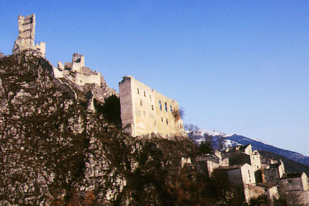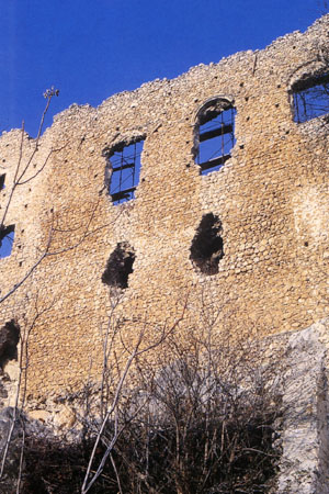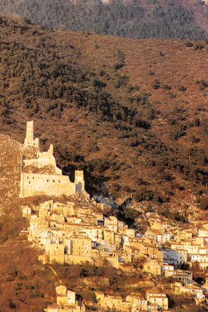 Il nucleo originario del castello era costituito dalla metà superiore del recinto, laddove la vegetazione lascia intravedere la sagoma fortemente compromessa di un' alta torre a pianta poligonale e un muro con alcune aperture che sembrano delimitare una sorta di piccolo ambiente interno. La metà inferiore, conclusa dalla grandiosa facciata di quello che dovette essere un palazzo tardo-medievale, si presenta come ampliamento della struttura più antica, probabilmente legato alla trasformazione della funzione originaria, da semplice luogo di difesa-avvistamento, a residenza del feudatario e la sua piccola corte. La particolare pianta di questa fortificazione rimane uno dei misteri più affascinanti dell'archeologia medievale abruzzese. L'andamento triangolare della struttura sembra ripetere, infatti, la forma della cresta rocciosa su cui si colloca: il torrione della parte alta della cinta muraria si trova proprio in corrispondenza del vertice superiore del triangolo immaginario, disegnato dalle linee di costa della montagna.
