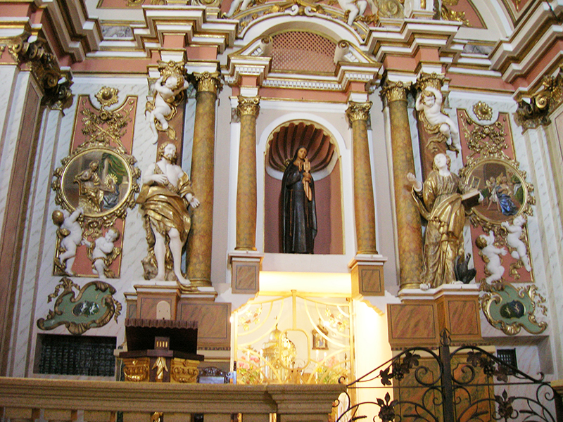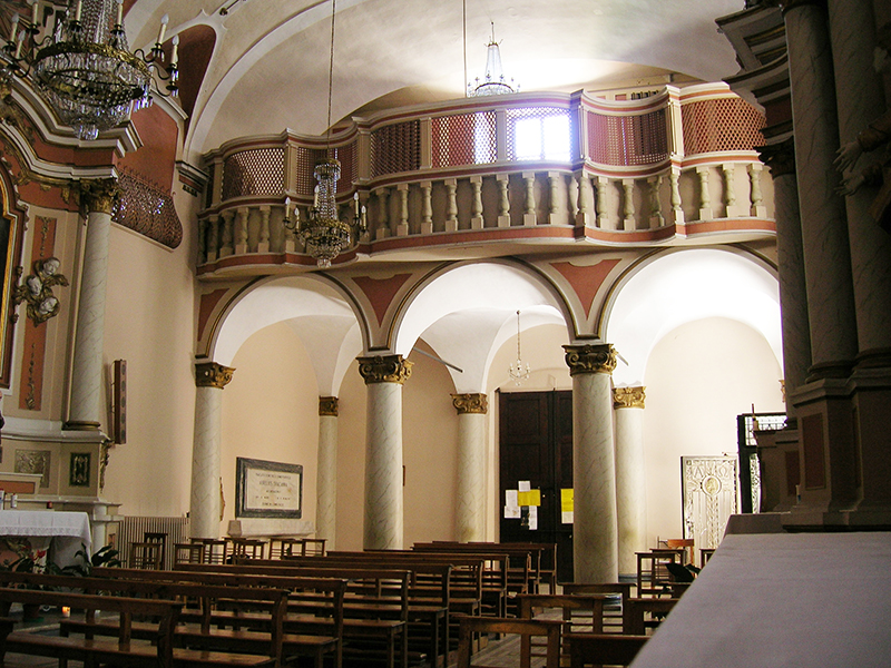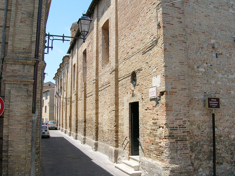 La chiesa e l’annesso convento delle Clarisse risalgono al Cinquecento, quando i Duchi Acquaviva fecero modificare una chiesa preesistente e donarono un immobile che ospitasse le suore. Oggi la facciata, interamente in laterizio, ci appare molto semplice ed è a coronamento orizzontale con lesene angolari. Vi si apre un portale ad architrave piano arricchito da due semicolonne decorate e sormontato da un timpano. Al di sopra di questo si apre un alto finestrone rettangolare. Dalla parete posteriore si erge un campanile a vela per tre campane di cui una sovrapposta alle altre due. Sopra l’archivolto del portale del Monastero è una lapide con stemma degli Acquaviva che reca la scritta “Io(s)ias ex ve(t)ustissima Aquaevivae domo mag(n)o et excellenti vir i(n)genio pace b(e)lloque pra(e)stantissimus Adriae dux i(llu)stris santique Flavia(n)i comes Teramique D(omi)n(u)s puteum hu(n)c effodi i(ussit) eminen(tiori) (pa)r(a)rique urbis loco aq(uam)”. Questa è storicamente molto importante, perchè cita i titoli di Giosia Acquaviva, che era duca di Atri, conte di S.Flaviano e signore di Teramo. L’interno è ad unica navata con quattro altari laterali barocchi, due dei quali con colonne tortili. I due del lato destro sono dedicati il primo ai “Tre Santi” (1650) ed il secondo a S.Gaetano da Thiene (1766); quelli del lato sinistro sono dedicati alla Madonna delle Grazie il primo ed all’Addolorata il secondo. Nella zona presbiteriale, sopraelevata di un gradino e separata dalla navata da una balaustra in marmo, è l’Altare Maggiore. In esso è incastonata l’ampia cella del Santissimo Sacramento, che fa parte della zona di clausura riservata alle suore. La comunità delle Clarisse esiste ad Atri almeno sin dal 1260, fondata probabilmente per volontà di Fra' Filippo Longo, francescano atriano che fece parte del primo gruppo di seguaci di S.Francesco.