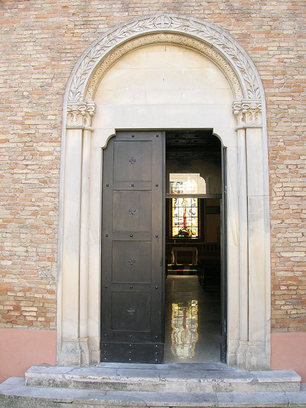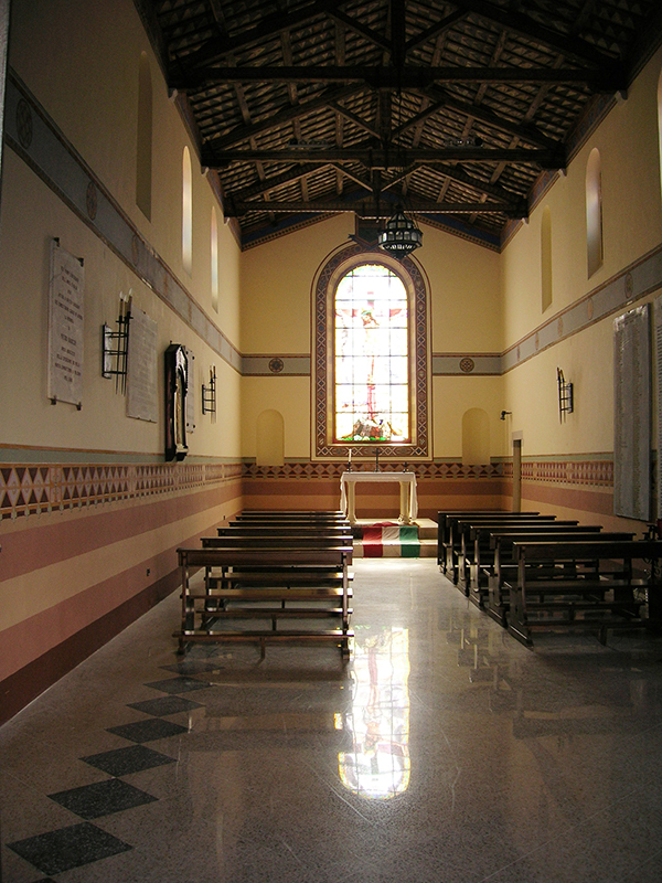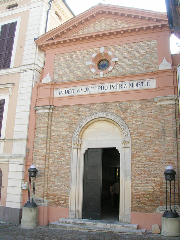 Rimasta Cappella degli Acquaviva fino al 1760, anno che segnò la fine del Ducato, seguì varie vicissitudini anche di degrado, fino al 1917, quando il Comune la acquistò insieme all’intero Palazzo e la restaurò. Essendo giunta intanto la fine della Prima Guerra Mondiale, venne adibita a Sacrario dei Caduti di Atri e riaperta al culto nel 1922. La chiesa si presenta con facciata in laterizio con terminazione a timpano. Su di essa si apre un portale ad architrave piano con arco a tutto sesto che ne delimita la lunetta e, più sopra una finestra rotonda incorniciata in laterizio. Tra il portale ed il rosone campeggia la scritta “In Deo vivunt pro Patria mortui” (I morti per la Patria vivranno in Dio). Sul lato posteriore destro è un piccolo campanile a vela per due campane innalzato nel restauro settecentesco. L’interno è ad aula unica con soffitto di capriate a vista. Sulle pareti alcune lapidi ricordano i nomi dei soldati atriani caduti in guerra, mentre dietro l’altare è una grande vetrata policroma raffigurante la Crocefissione, opera realizzata nel 1933 dal maestro vetraio atriano Alfredo Ferzetti (1895-1980).