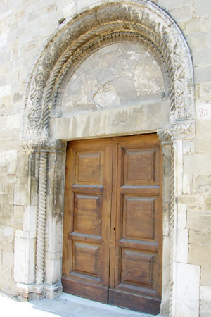 La chiesa di S. Andrea Apostolo venne edificata ai primi del Trecento, con annesso l'Ospedale dei Proietti, fondato nel duecento. L'ospedale venne dismesso ed al suo posto vi trovò sede un prestigioso Collegio, fondato dal grande P. Claudio Acquaviva, quando governava quell'ordine religioso, V° Generale dopo S. Ignazio di Loyola. Altre frequentazioni ebbe questo edificio comunale, sede anche di una eccellente Scuola di Arti e Mestieri avviata agli inizi di questo secolo, per cui si susseguirono lavori murari, che però non demolirono del tutto un sorprendente monumento di età romana, il Teatro, che si celava nelle fondazioni. Questo manufatto vanamente ricercato da una serie di studiosi, è tornato alla luce solo nel 1984 ed una prima campagna di scavo ha dato risultati insperati, portando in evidenza resti di gradinate, corridoi, arcate, cavea, che lo hanno fatto attribuire all'età augustea. Tutto l'edificio è un'opera scultorea di stile romanico del primo decennio del Trecento eseguita da Mastro Rainaldo e la sua scuola marmoraria, ove sono ripetuti, impoveriti, gli elementi del grande portale del Duomo.