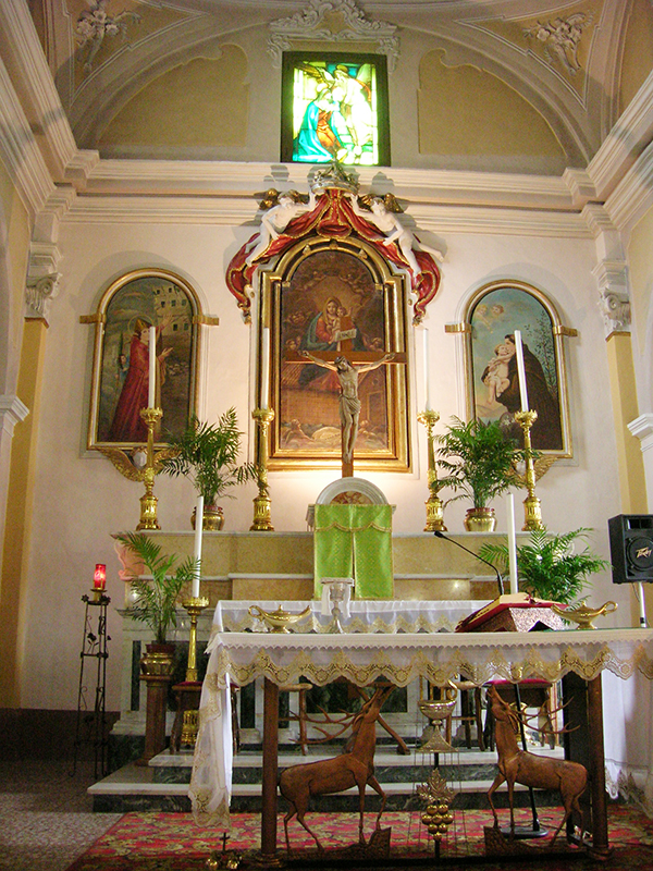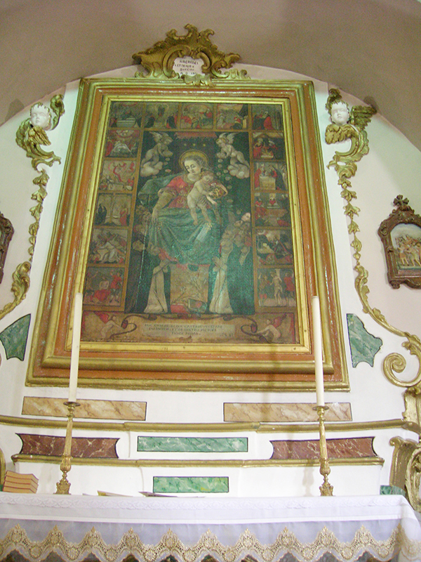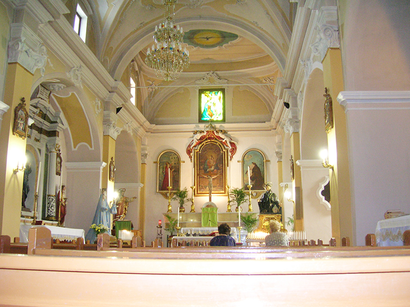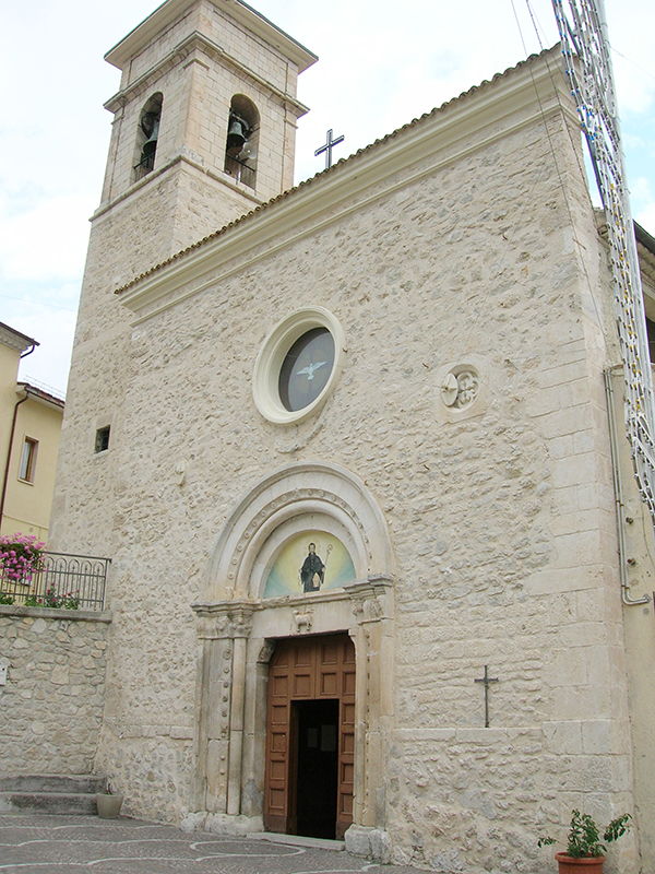 La chiesa, oggi intitolata alla Madonna di Loreto, è ricordata per la prima volta gli inizi del sec. XIV nei registri delle decime valvensi col nome di "Santa Maria della Villa". La facciata si presenta attualmente nella veste assunta dopo il recente restauro che ha permesso il recupero dell'antico parametro in pietra ed ha rportato alla luce una bella finestra circolare ornata con un motivo a traforo, sicuramente appartenente all'impianto originario. Di fianco alla chiesa, tra la facciata e il campanile, è murato un bassorilievo con un angelo, che ricorda quelli genuflessi della lunetta di San Michele. Pulendo l'archivolto del semplice portale in pietra locale, sono emerse un epigrafe in caratteri gotici assai consunti, e una data che sembra potersi interpretare come MCCC..., quindi coeva alle prime attestazioni storiche della chiesa. L'interno è costituto da un'aula con copertura a volta e altari laterali, di cui si segnala quello della Madonna del Rosario per il bel dipinto su tela di analogo soggetto recante la data 1581 e un distico latino in onore della Vergine. In fondo alla navatella laterale, popolarmente detta "il cappellone", si erge l'altare di San Domenico Abate, che ospita nella nicchia centrale una statua del santo. Il dossale dell'altare, risalente al 1621, è modellato in stucco e poggia sua una mensa in pietra, probabilmente da identificare con l'altarino che la tradizione vuole portato a Villalago, insieme con una piccola campana, dal monastero di San Pietro. Sotto la mensa sono state sistemate a vista le travi lignee che costituivano il letto di San Domenico nel ritiro di Prato Cardoso. Nella sacrestia si conserva un interessante reliquiario in argento deò sec. XV a forma di tempietto gotico, che contiene la reliquia del dente morale di San Domenico.