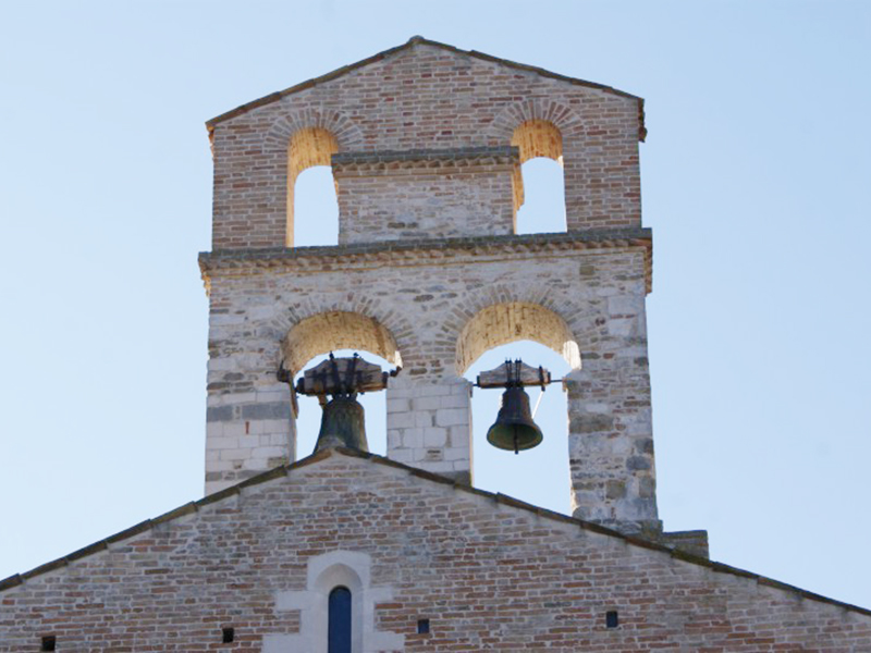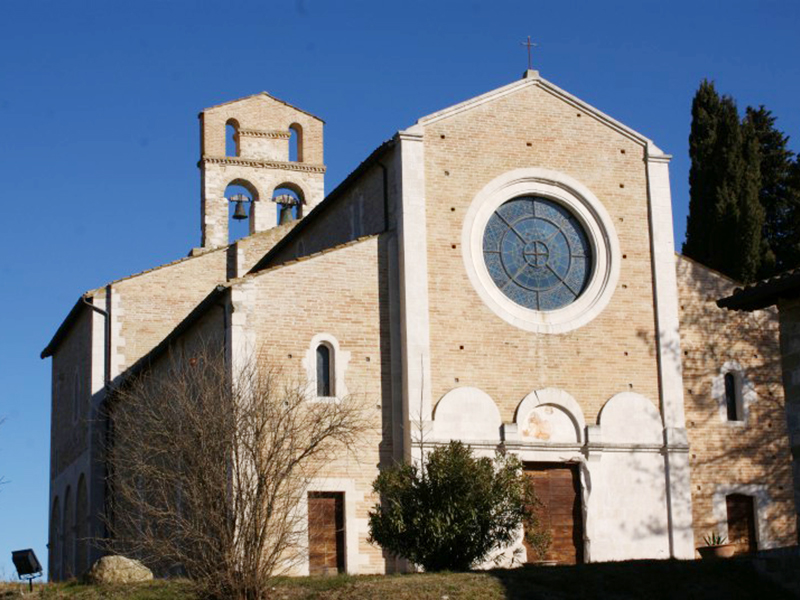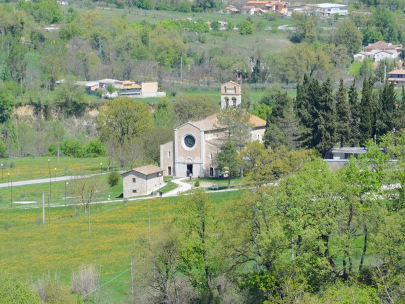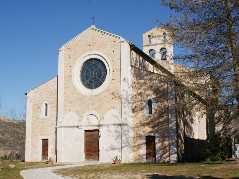 Complesso monastico benedettino il cui convento non esiste più perchè distrutto da un incendio in epoca medievale, si ritiene che la sua costruzione risalga alla fine del 1100 ed il suo stile architettonico presenta una chiara impronta romanica, con alcuni particolari che richiamano certe chiese pugliesi. La facciata è divisa in tre parti, di cui quella centrale, la più grande, presenta un rosone nella sua parte alta ed un semplice portale ad architrave piano sormontato da una lunetta al cui interno sopravvivono alcuni sprazzi di affreschi. Le due laterali hanno entrambe una stretta monofora ed un portale ad architrave piano. Dalla parte posteriore del tetto si erge un campanile a vela in laterizio e pietra in cui sono collocate due campane. La copertura è a capanna nella parte centrale e a spioventi contrapposti in quelle laterali. L’aspetto esterno trova corrispondenza all’interno con la presenza di tre navate, una grande centrale e due laterali più piccole, separate da tre grandi archi a tutto sesto per ogni lato che poggiano su alti pilastri cruciformi. Ogni navata termina con un’abside e quella centrale prende luce da una grande monofora che all’esterno risulta incorniciata da motivi ornamentali, mensole, colonnine e capitelli. Le absidi ed il transetto sono quasi completamente affrescate da opere medievali raffiguranti momenti significativi del Vecchio e Nuovo Testamento.