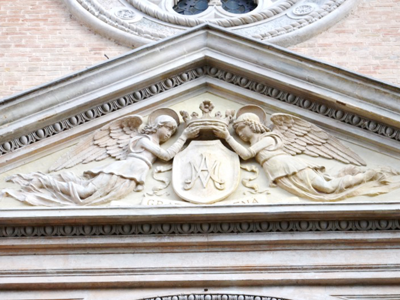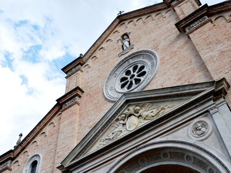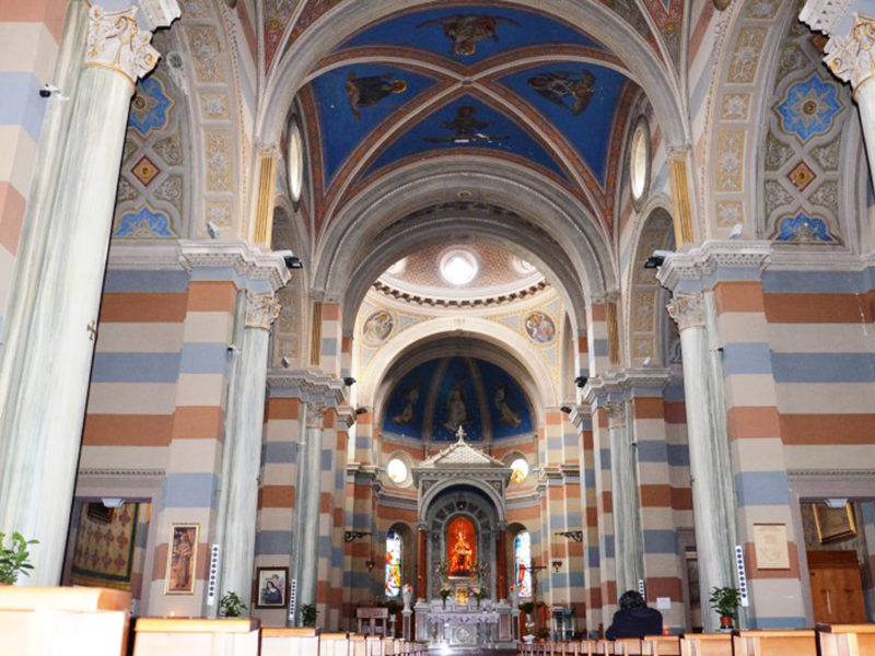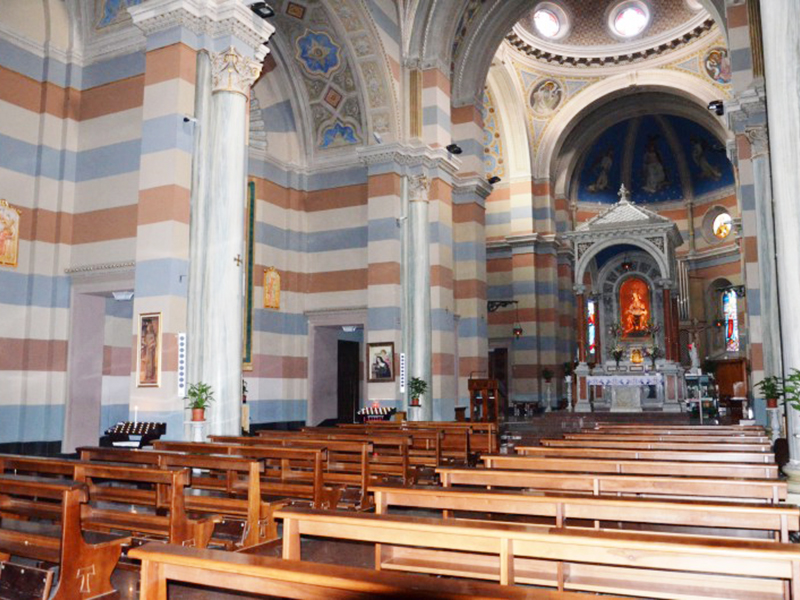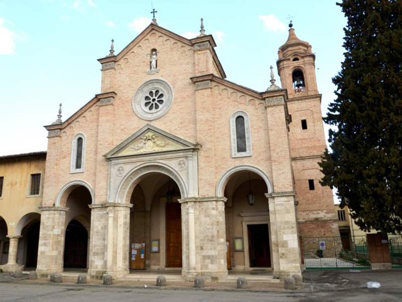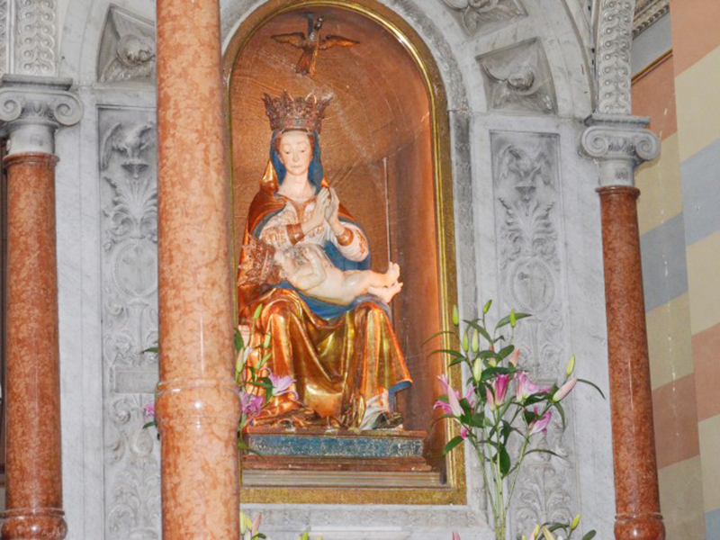 La chiesa, che originariamente era in stile romanico, venne abbattuta e ricostruita tra il 1892 ed il 1900, su progetto architettonico del pittore romano Cesare Mariani (1826-1901). Ha una facciata mistilinea in laterizio, con rosone centrale e due finestroni rettangolari ai lati. Un piccolo portico con archi a tutto sesto sormontati da timpano precede i tre portali d'ingresso. Al suo fianco sinistro si appoggia la torre campanaria, anch'essa in laterizio, la cui base a pianta quadrata risale alla fine del Quattrocento, mentre la parte superiore venne ultimata in stile barocco verso la fine del Seicento. La chiesa si sviluppa con pianta rettangolare ad una sola navata che termina con l'abside e tre cappelle per lato. Il soffitto è sorretto da volte a crociera, con una cupola semisferica affrescata da Cesare Mariani. Sull'altare maggiore è la statua in legno policromo risalente al XV secolo raffigurante la Madonna delle Grazie che siede con il Bambino disteso in grembo, autentico capolavoro dell'arte abruzzese.