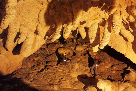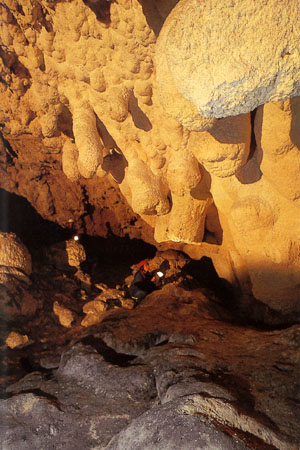 L'ingresso della grotta immette direttamente alla prima sala caratterizzata da un pavimento costituito da grandi blocchi. Questi sono stati prodotti da almeno tre fasi imponenti di crollo. In prossimità della parete in opposizione all'ingresso della grotta, l'abbassamento della volta e l'accumulo di blocchi di crollo, ha determinato un restringimento: è da qui che si perviene alla seconda sala. Anche in questo ambiente il pavimento è formato da blocchi di crollo, qui allineati ai piedi di una faglia che attraversa tutto il soffitto della sala. Nella prima sala sono presenti stalattiti poste in prossimità del restringimento, mentre nella seconda sala sono presenti numerose stalattiti e stalagmiti. Le caratteristiche mineralogiche delle stalattiti nella grotta Nera, sono alquanto insolite per la loro consistenza "plastica", detta "latte di monte". Sono uno degli aspetti più affascinanti di questa grotta.