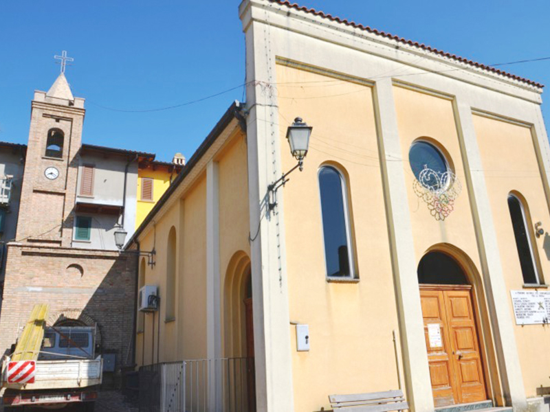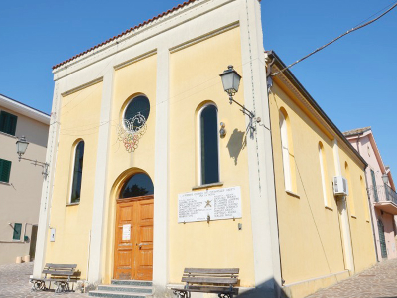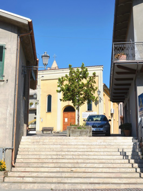 E’ una costruzione risalente alla prima metà dell’Ottocento avente copertura a capanna e facciata a coronamento piano. La facciata scandita da lesene ha un semplice portale e due alti finestroni ai suoi lati, tutti ad arco a tutto sesto, mentre più in alto si apre un finestrone rotondo. La peculiarità di questa chiesa, forse unica nel suo genere, è di avere la torre campanaria, completamente in laterizio, incastonata in una abitazione privata che si trova alle spalle della chiesa.