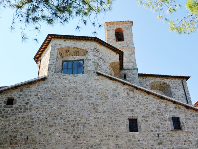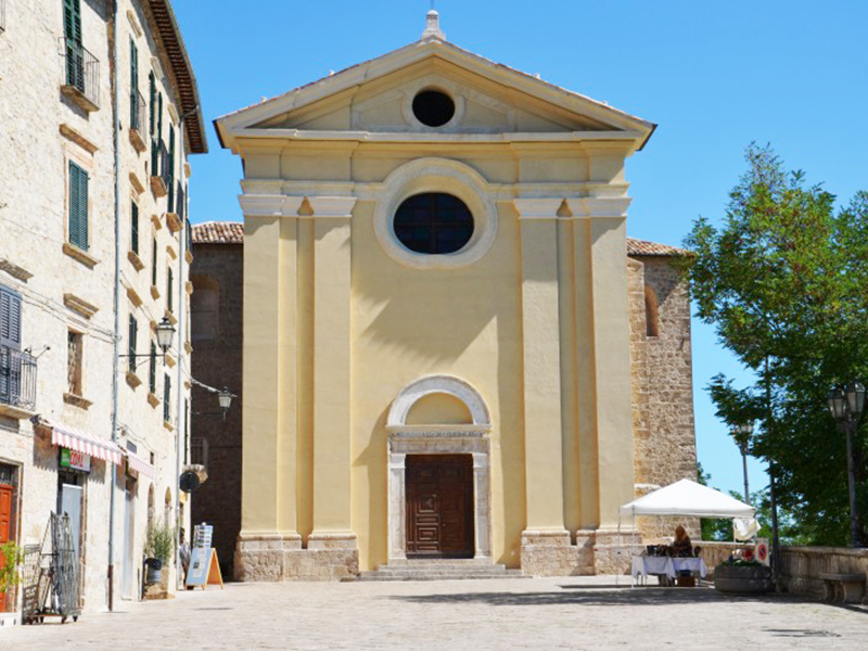 E' nota alle fonti storiche fin dal 1153. Si trovava appena fuori le mura cittadine e venne eretta a collegiata nel 1487. Nel 1557, durante l’assedio delle truppe franco-pontificie, venne trasformata in bastione a difesa del borgo e poi ricostruita pochi anni più tardi a ridosso dell’accesso di Porta Napoli. Dal 1777 al 1790 subisce importanti trasformazioni estetiche e strutturali in stile barocco, rimanendo rinascimentale il solo portale. Questo è ad architrave piano sormontato da lunetta, appena al di sotto della quale campeggia la scritta “Haec est domus Dei firmiter edificata”. La torre campanaria, a base quadrangolare, è innestata tra il braccio del transetto e l’abside. L'interno è a navata unica a cui vennero aggiunte due cappelle laterali terminanti con absidi, a formare un transetto. La zona presbiteriale trova posto nell’abside e l’incrocio della navata con il transetto è sormontato da una cupola ottagonale.