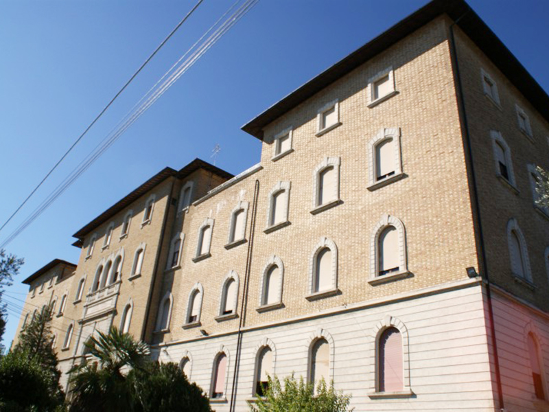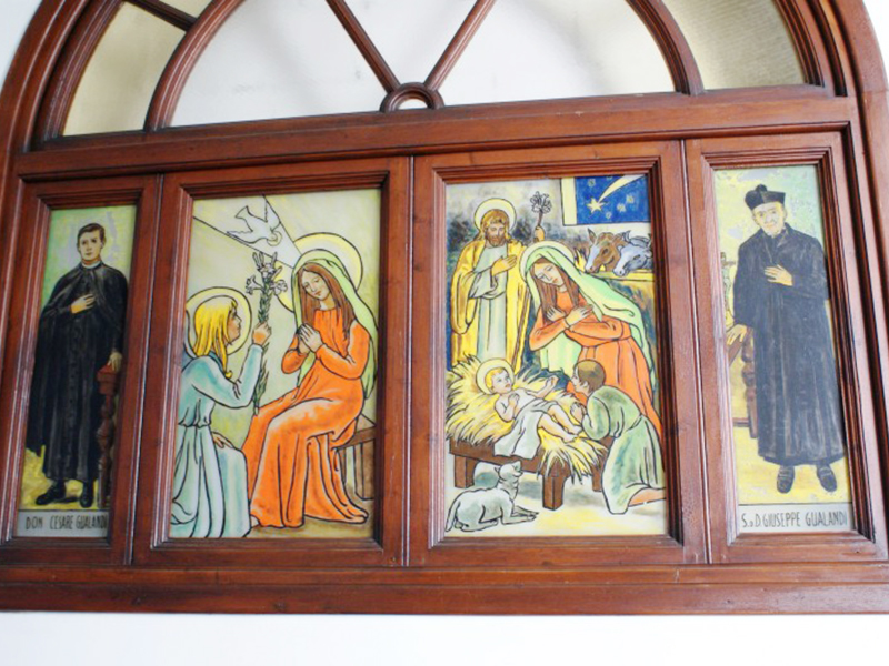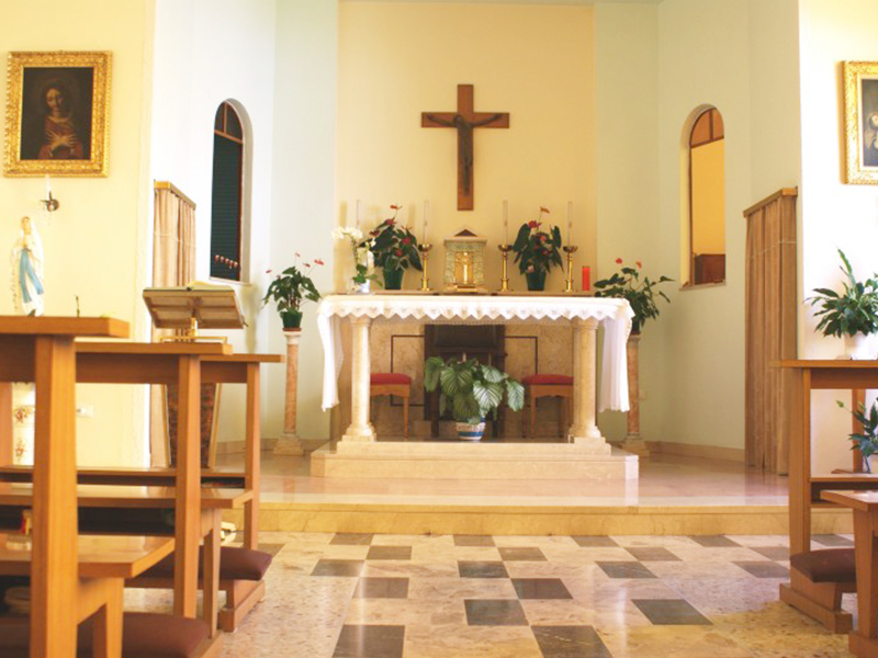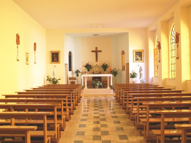 E' costituita da un'unica aula, ariosa e ben illuminata, che termina con un'abside a pianta poligonale; qui, sopraelevato di un gradino, è collocato l'altare. Ai lati dell'abside le statue della Madonna Immacolata a mani giunte e di S. Giuseppe con in braccio Gesù Bambino guardano i fedeli. Sulla parete dietro la statua della Madonna campeggia un dipinto raffigurante la Madonna dei Sordomuti, rappresentata con le braccia strette al petto. L'opera originale, della scuola del Guercino, è gelosamente custodita nella Cappella della casa madre dell'Istituto Gualandi a Bologna. Inizialmente di proprietà della famiglia Gualandi, il quadro fu donato dal prof. Domenico Gualandi a suo figlio don Giuseppe in occasione dell'inaugurazione della prima sede bolognese dell'Istituto il 10 settembre 1850, intendendo così porre sotto la protezione della Madonna quella pia opera nei confronti dei sordomuti. Ancora oggi nella mimica dei sordomuti per indicare la Madonna si fa proprio il gesto di stringersi in croce le braccia al petto. Lungo il corridoio che si percorre prima di entrare nella Cappella sono posti tre finestroni sui cui vetri sono rappresentati a pittura don Cesare e don Giuseppe Gualandi, S. Gabriele, il Beato Nunzio Sulprizio, S. Camillo de Lellis, S. Francesco e varie scene ispirate al Vangelo.