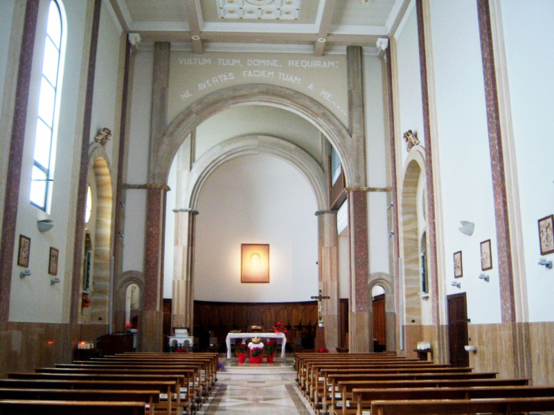 Nel 1959 venne inaugurata la Chiesa del Santo Volto, annessa all’omonimo monastero dei monaci Benedettini Silvestrini, sulla Via Gramsci. Il monastero, nato nel 1953 su una preesistente villa donata dalla famiglia Mancini di Teramo, fu dedicato al Santo Volto per la particolare devozione del suo fondatore, Padre Ildebrando Gregori (1894-1985). La Chiesa si presenta con una bella facciata a capanna in mattone rosso arricchita da due altissime colonne utilizzate come austeri elementi decorativi che danno ancora più slancio all’intera struttura. L’interno della chiesa sobrio ed elegante, ristrutturato e modificato nel 2003, ha un’unica navata e si conclude con un’abside. Questa racchiude l’intera zona presbiteriale sopraelevata di due gradini, dove trovano posto l’altare ed un chorus ligneo. Sulla parete posteriore dell’abside campeggia un’immagine del Volto Santo, resa suggestiva da una sapiente retroilluminazione.