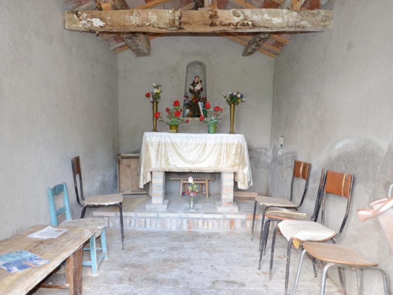 Posta in cima ad una ripida salita, si presenta con tetto a capanna e semplice portale ad architrave piano, al lato sinistro del quale si apre una finestrella quadrata. Sul culmine del tetto in corrispondenza della facciata si alza un piccolo campanile a vela in mattoni con arco a tutto sesto; l’unico posto disponibile per una campana è attualmente vuoto. L’interno ha un’unica aula la cui copertura è con travi in legno, alcune delle quali marcescenti, e tavellette a vista. Poche e povere suppellettili essenziali ne costituiscono l’arredo.