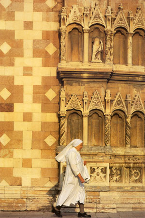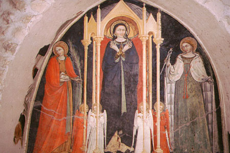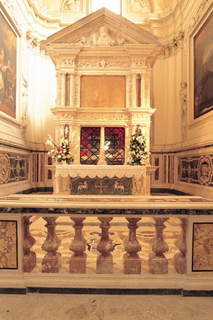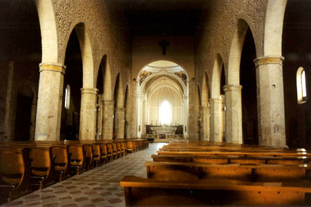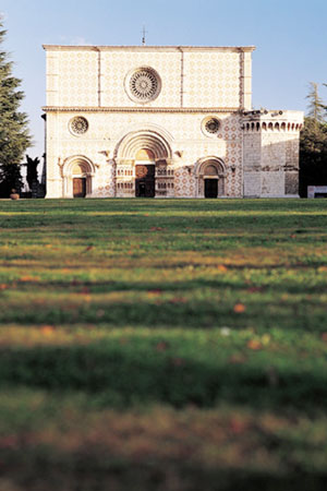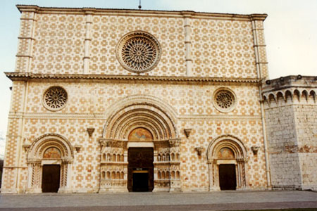 La basilica, che per dimensioni è la più grande d'Abruzzo, è strutturata a croce latina. Un recente restauro ha liberato l'interno dalle sovrastrutture barocche e ha restituito alle tre navate la spazialità originaria scandita dalle arcate ogivali poggianti su pilastri ottagonali. La copertura è a capriate lignee a vista, la pavimentazione di stile cosmatesco, disseminata di pietre tombali, in massima parte di abati generali dell'Ordine celestino, ripete il motivo policromo delle pietre bianche e rosa. L'illuminazione è data da una fila di finestre gotiche sulle navate laterali, dai rosoni posti sulla parete di ingresso e dalle aperture del presbiterio e della cupola. Sulla parete della navata di destra si aprono tre nicchie gotiche racchiudenti dipinti quattrocenteschi che raffigurano, rispettivamente, la Madonna con le Sante Apollonia e Agnese, l'Assunzione e incoronazione della Vergine, la Crocifissione. Sempre nella navata di destra un bell'organo monumentale (sec. XVIII) in legno intagliato e dorato con cantoria decorata a bassorilievi con scene della vita di Cristo. Una serie di olii di Karl Rutter (sec. XVII), pittore fiammingo divenuto monaco celestino con il nome di Andrea di Danzica, illustra, sulle pareti, la vita di Celestino V. Tre archi immettono nel transetto che mantiene le forme barocche e si conclude in tre absidi. Sull'altare di destra è esposta una Madonna realizzata in terracotta policroma da Silvestro dell'Aquila (sec. XVI). Dal 1327 Santa Maria di Collemaggio accoglie le spoglie di San Pietro Celestino. Il mausoleo di marmo eseguito nel 1517, su commissione dell'Ordine della Lana da Girolamo da Vicenza, ripete con eleganza le forme del rinascimento lombardo. Finemente decorato con due ordini di colonnine e pilastrine racchiude l'urna delle spoglie del Santo che, in passato, subirono una duplice dispersione, la prima volta nel 1528, da parte delle truppe del Principe d'Orange che asportarono la cassa in argento cesellato di scuola sulmonese e la seconda, nel 1799, da parte dei francesi che trafugarono l'urna settecentesca.