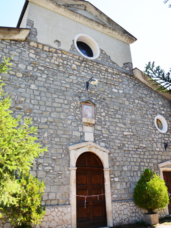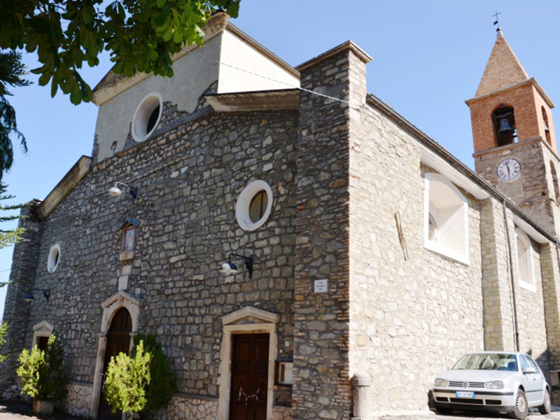 Essa si trova all’ingresso del paese ed è un edificio massiccio completamente in pietra restaurano in tempi recenti nel 1908 e poi nel 1961. E’ costituito da un corpo di fabbrica centrale più alto con copertura a capanna e da due corpi di fabbrica laterali più bassi con copertura a unico spiovente contrapposto. Le profonde strombature delle finestre danno la misura della larghezza dei muri perimetrali. In facciata si aprono tre portali in pietra. Alla parete posteriore è poggiata una torre campanaria a base quadrata che termina con una guglia. Nonostante l’assetto esterno l’interno è a navata unica, al termine della quale, sull’Altare Maggiore barocco datato 1749, è la statua del Santo Patrono S.Leucio. Su un antico architrave rimesso in opera sulla porta di ingresso di una casa del centro storico è leggibile la data 1471 sopra ad uno stemma bernardiniano e fregio ad esagono racchiuso in un cerchio. Su un altro architrave è la data 1510. In una delle viuzze è visibile un bellissimo gafio, caratteristico balcone in legno costruito con antiche tecniche edilizie longobarde.