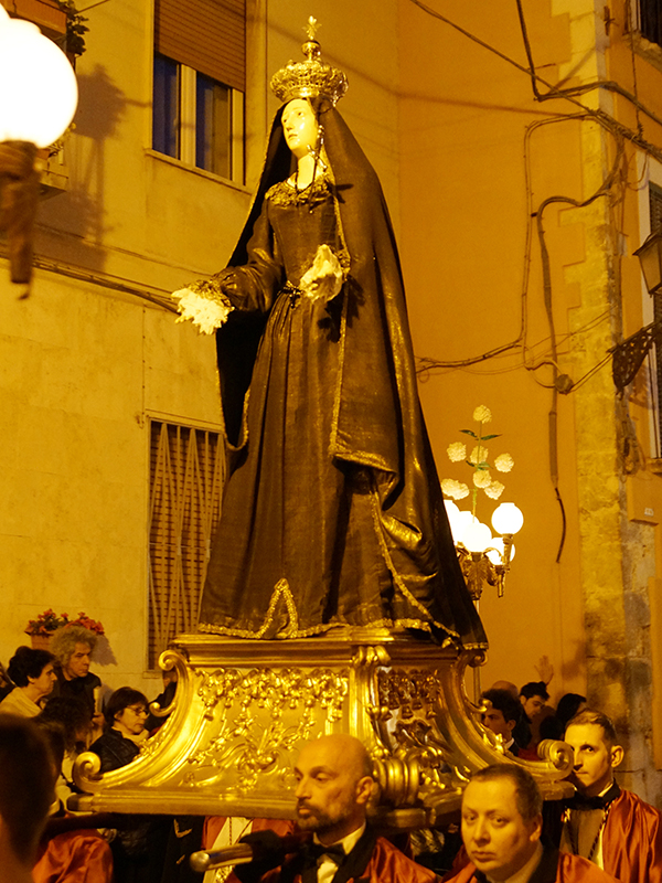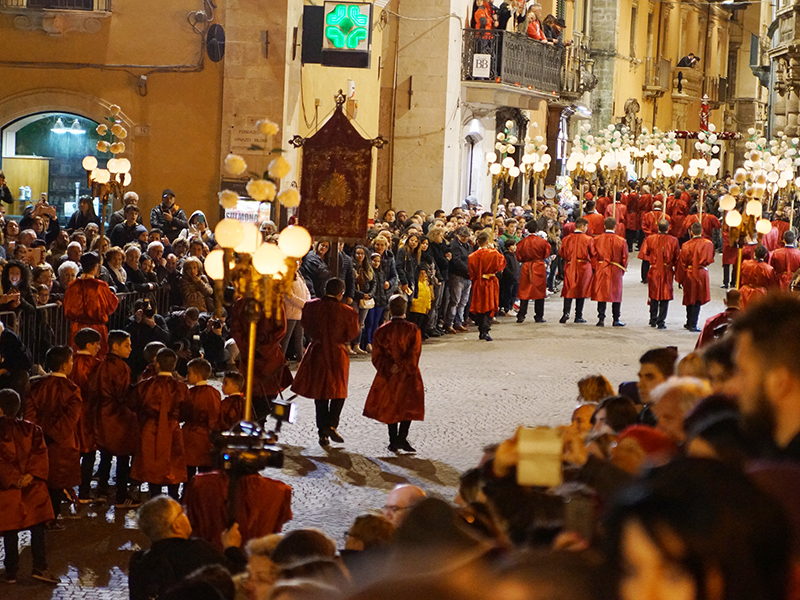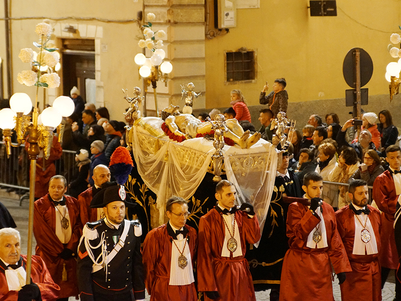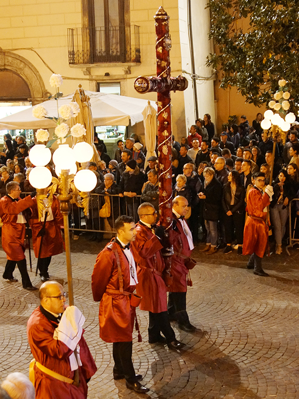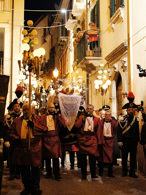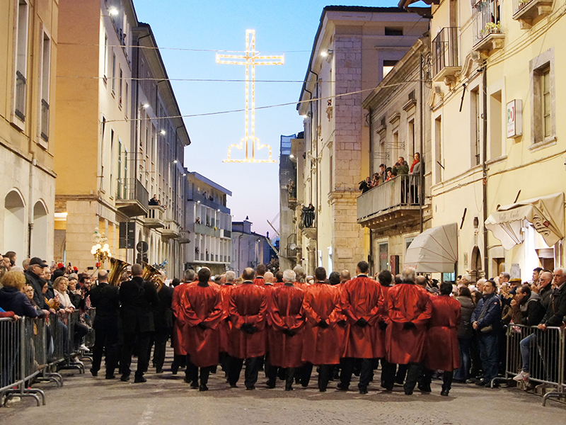 Se altrove è il colore nero che caratterizza i riti della Settimana santa e in particolare la processione del Venerdì, a Sulmona il colore della passione e morte di Gesù Cristo è rosso, come il sangue e come le insegne sociali dell'Arciconfraternita della Santissima Trinità, una delle più prestigiose ed antiche d'Abruzzo. Per l'Arciconfraternita dei Trinitari il momento più solenne, giunge ogni anno, con l'organizzazione della processione del Venerdì Santo. Sul fare della sera, dalla sontuosa chiesa barocca che si apre sul Corso, esce il corteo preceduto da una banda di ottoni che intona, alternativamente, due marce funebri. Segue il quadrato, una compatta formazione di confrati che indossano il sacco rosso del sodalizio e reggono gli artistici lampioni che illuminano la parata. In mezzo a loro sta il Tronco, grande croce di velluto cremisi, ornata di tralci e grappoli d'argento. La processione, che attraversa fino a tarda notte le suggestive strade del centro storico rischiarate dal fuoco delle fiaccole e dei bengala, avanza con il caratteristico passo lento e solenne detto struscio. Giunti davanti a Santa Maria della tomba i Trinitari incontrano i confratelli della Madonna di Loreto che organizzano la rappresentazione domenicale della Madonna che scappa in piazza. Ad essi, rispettando un antico cerimoniale, ricco di significati storici e sociali i Trinitari cedono l'onore del trasporto delle statue entro l'antico sestiere di Santa Maria e fino alla chiesa della Trinità dove la processione ritorna a notte fonda.