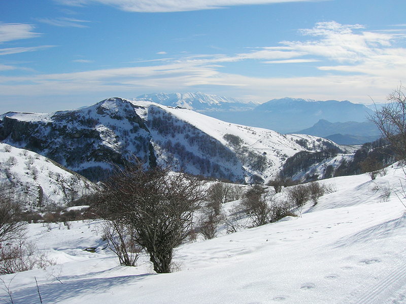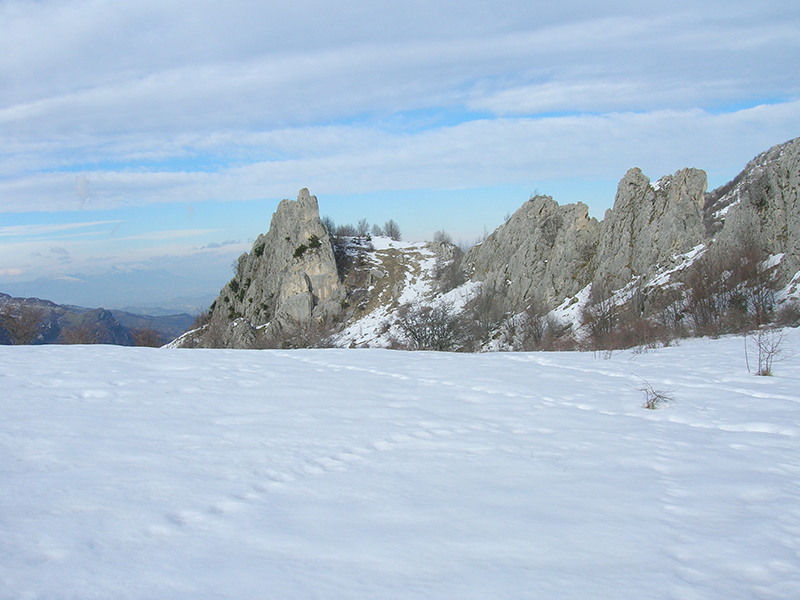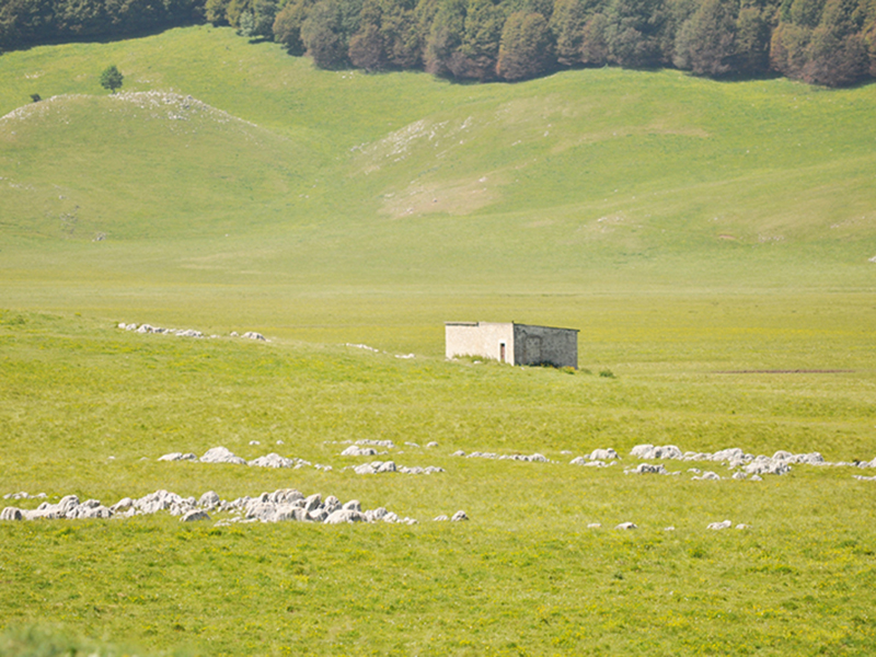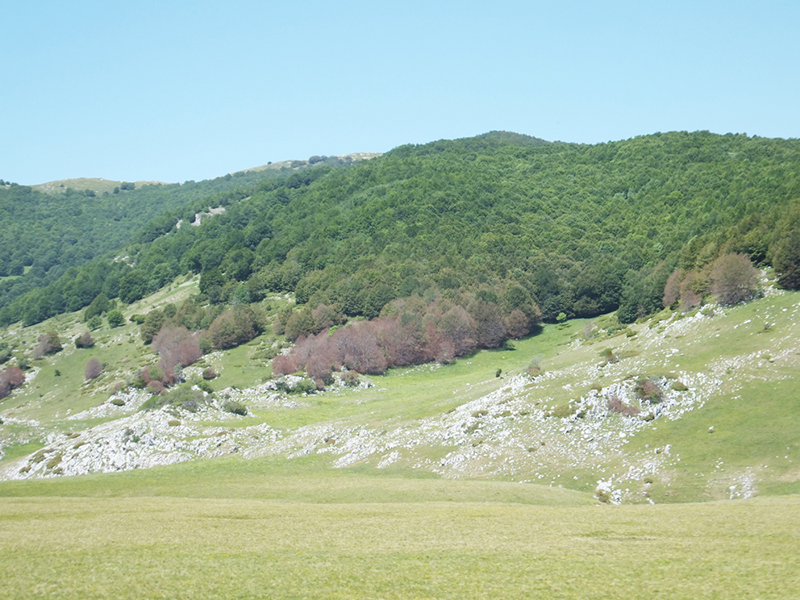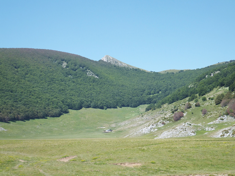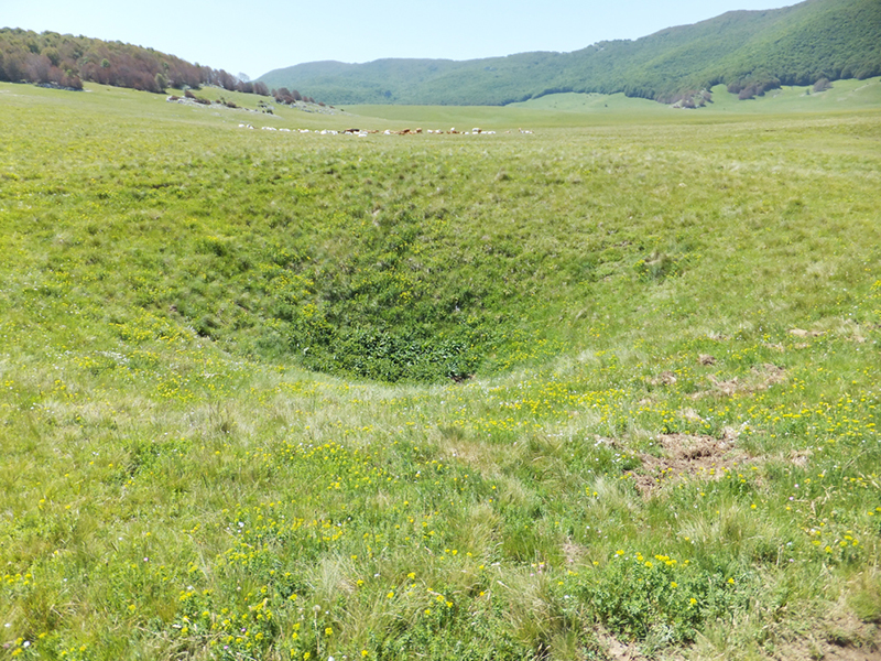 La Val Voltigno, localizzata sulle pendici orientali del Gran Sasso a circa 1350 metri s.l.m. è un bell'esempio di piano cosparso di doline e di uvale. Si tratta di un bacino chiuso, senza sbocchi superficiali, le cui acque vengono smaltite attraverso un complesso sistema di inghiottitoi. Il piano è occupato da diverse forme di vegetazione, periodicamente o perennemente inondate, alcune delle quali rappresentano delle vere rarità. Tra le associazioni erbacee citiamo il pascolo acidofilo con nardo (Nardus stricta) ed euforbia abruzzese (Euphorbia gasparrini subsp. Sannitica), endemica dell'Appennino centrale. Nei prati umidi periodicamente inondati è molto comune il ranuncolo della Marsica (Ranunculus marsicus), endemico dell'Abruzzo, e vi vegetano anche la coda di topo dei prati (Alopecurus pratensis), la cicerchia pannonica (Lathyrus pannonincus subsp. Asphodeoides), leguminosa a distrubuzione steppico-eurosiberiana, in Italia nota solo in Abruzzo, l'astranzia maggiore (Astrantia major) ed il narciso dei poeti (Narcissus poeticus), che per le sue straordinarie ed esuberanti fioriture bianche può assurgere a simbolo delle conche carsiche. Nelle depressioni sono insediati, più o meno frammentariamente, diversi aggruppamenti legati all'ambiente acquatico e caratterizzati dalla grasca comune (Potamogeton natans), dal ranuncolo a foglie capillari (Ranunculus trichophyllus susnsp trichophyllus), dalla giunchina (Eleocharis palustris), dalla carice cenerina (Carex canescens) e dalla salcerella erba-portula (Lythrum portula).