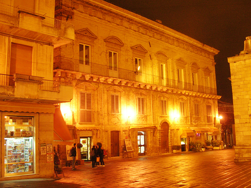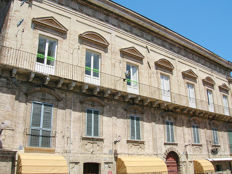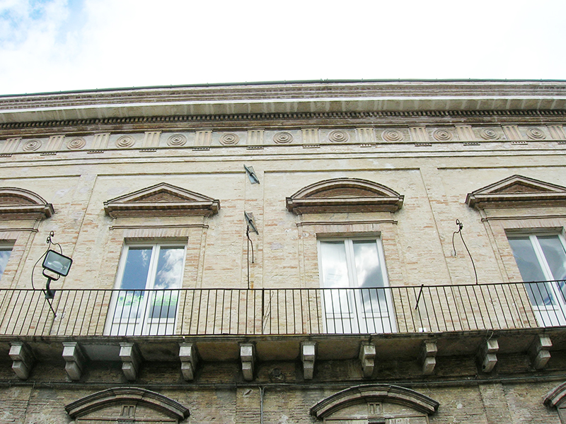 Realizzato nel '700 secondo canoni di ascendenza rinascimentale, presenta la facciata in laterizio decorata da una fascia di formelle circolari che corre lungo il cornicione sporgente mettendo in risalto l'alternanza di timpani triangolari e curvilinei delle finestre del piano nobile, collegate da una lunga balconata su mensole. Oltrepassato l'ingresso, si resta colpiti dalla bianca scalinata a volte rampanti su pilastri, che ricorda con simili esempi l'architettura napoletana settecentesca, svettante sul pavimento in acciottolato di fiume e opus spicatum. Sulla volta di una delle sale interne il pittore Francesco Maria De Benedictis ha dipinto, verso la metà dell'800, una Leda con il cigno.