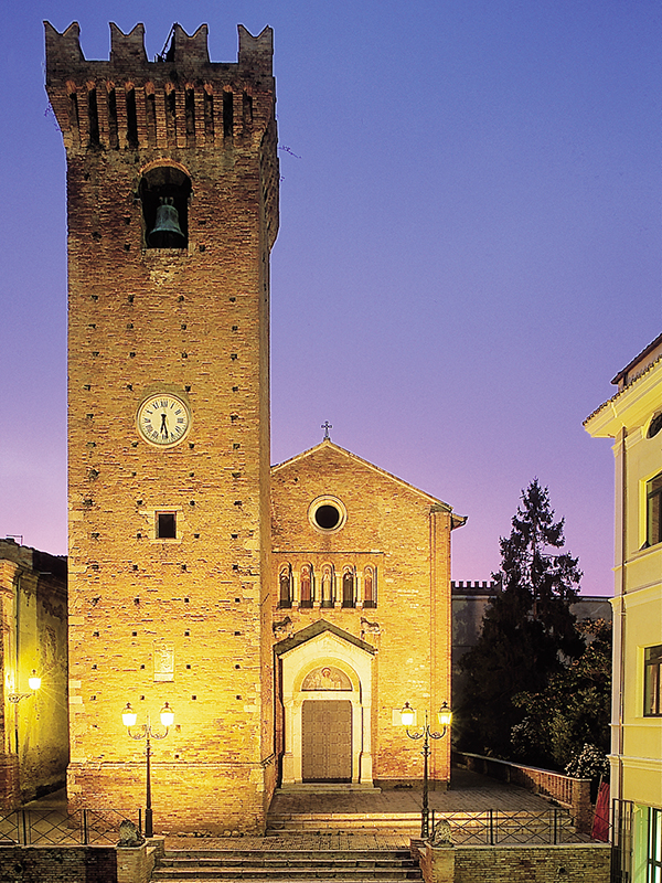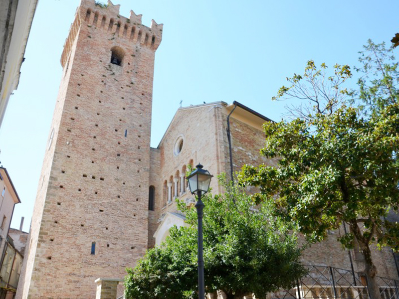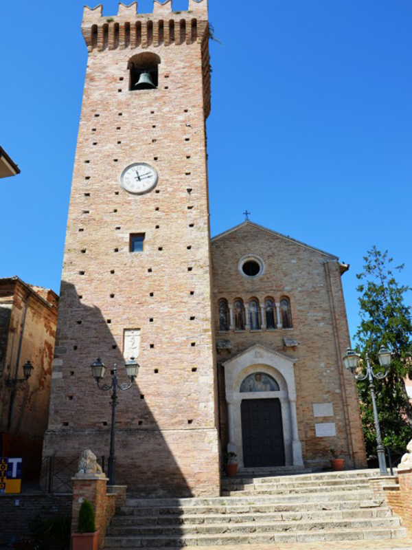 Alta m.28, ha pianta quadrata da m.6 per lato ed è coronata da merli e beccatelli. L’iscrizione su una lapide murata sulla torre stessa dice che venne costruita per volere del frate benedettino Matteo di Angelo da Morro nel 1397, quando feudatario di Mosciano era Andrea Matteo I d’Acquaviva. Intorno al XVI secolo, in occasione di lavori di restauro riguardanti la chiesa, vi furono create le aperture per le campane e venne utilizzata come torre campanaria. Oggi vi sono alloggiate quattro campane, su cui si legge: sulla prima "Questa campana, di proprietà della Confraternita del Pio Monte dei Morti di Mosciano, fu rifusa il settembre 1876 dall'artefice di Gagliano Aterno di Aquila"; sulla seconda "A.D. MDCCCLXI (1856)"; sulla terza "A.D. MDCCCXCIX (1899) - Artefice Filippo Paolone di Guardia Vomano"; sulla quarta "Questa campana rifusa nel 1853, tacque nel 1925. Il popolo di Mosciano volle che aumentata fosse e richiamata a vita novella perché la sua pietà alla memoria dei posteri durasse. A.D. MCMXXX (1930) - Fonderie Colbacchini di Padova".