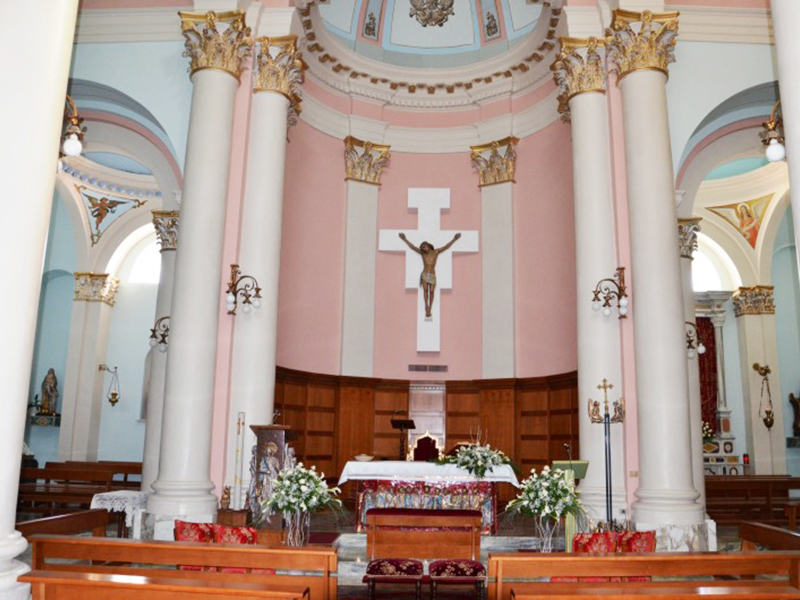 La facciata, abbellita da timpano e lesene, è a coronamento orizzontale e su di essa si apre un portale in pietra ad architrave piano. Alla sua parete posteriore è appoggiato un campanile in laterizio che termina a guglia e sorregge due campane. L’interno è costituito da una navata grande centrale e due navate laterali più piccole, ognuna delle quali termina con un’abside. Quello della navata centrale, sovrastato da cupola, ospita la zona presbiteriale ed un chorus ligneo. Nella cantoria sopra il portale d’ingresso si trova un pregiato organo a canne realizzato nel 1796 dall’organaro di Vasto Onofrio Cacciapuoti e restaurato nel 1874 dall’organaro di Notaresco Vitale De Luca.