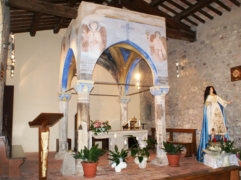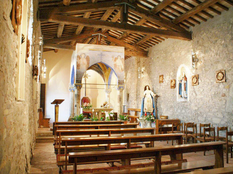 Di essa si conosceva l’esistenza già nel 1154 e si presenta oggi nelle vesti dell’ultimo restauro, quello del 2004: ha copertura a capanna ed ingresso laterale tramite un semplice portale con architrave piano in pietra. In corrispondenza della parete posteriore si erge un campanile a vela che ospita due campane. La muratura è costituita da pietre squadrate legate da poca malta ed in una delle cornici dei finestroni laterali è rimesso in opera, al contrario, uno spezzone in pietra con porzioni di scritte latine. L’interno è a navata unica, ma un grande arco a tutto sesto lungo la parete di destra, molto simile a quello presente nella chiesa di S.Flaviano a Tavolero, lascia intuire la presenza nel passato di un ambiente laterale aggiuntivo. Alla fine della navata non c’è abside e nella zona presbiteriale sopraelevata di due gradini rispetto al resto trova posto un bel ciborio del XIV secolo con volta a crociera e con archi ad ogiva che poggiano su colonnine ottagonali. Sui capitelli di queste è riprodotto lo stemma di Montorio al Vomano costituito da tre monti all’italiana sormontati da tre spighe. Al di sotto del ciborio si trova l’altare, la cui mensa è costituita da una pietra forse proveniente da un luogo di culto preesistente. All’interno è rimessa in opera un architrave in marmo recante una porzione di epigrafe latina. Vi si conserva una bella Madonna con Bambino in legno di ulivo risalente forse al XIII secolo ed attribuita al Maestro della Santa Caterina Gualino, straordinario intagliatore abruzzese attivo tra il XIII ed il IX secolo.