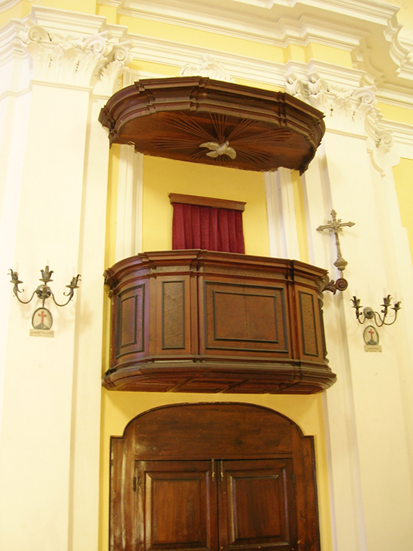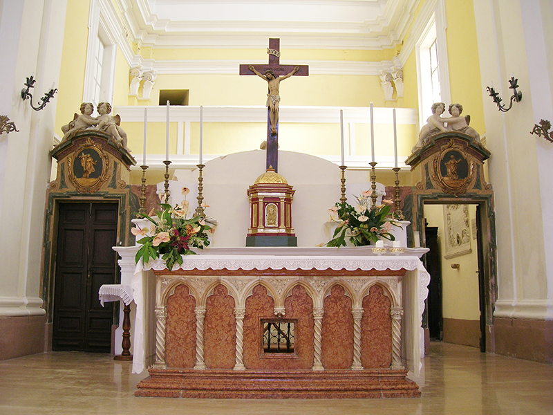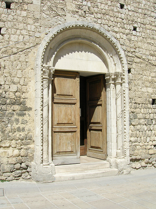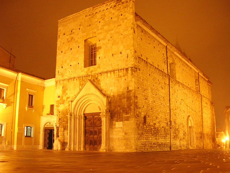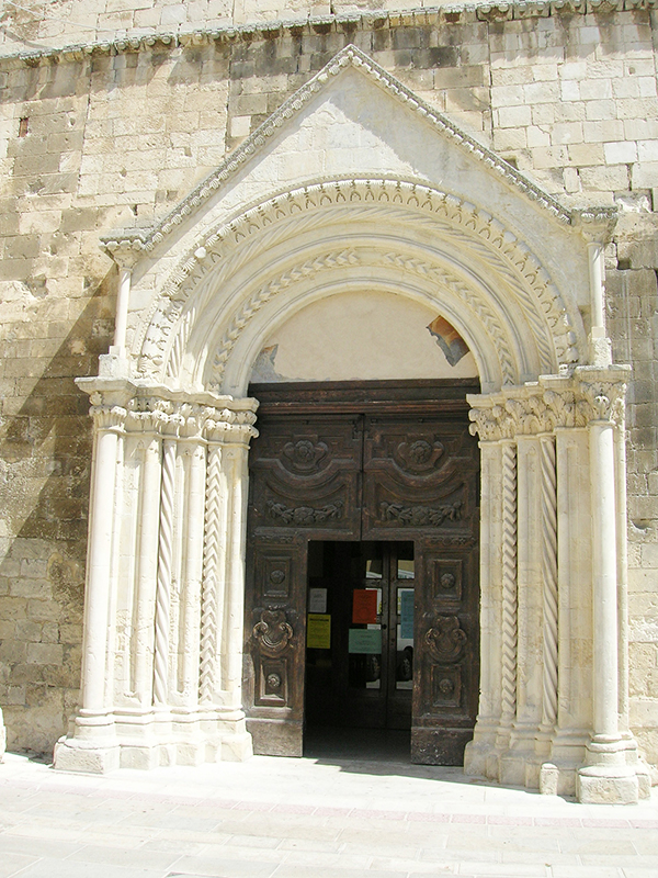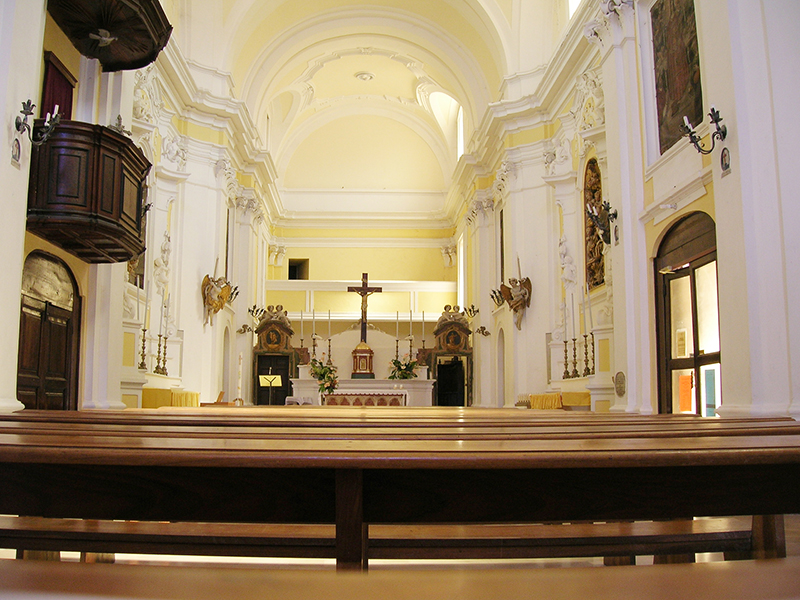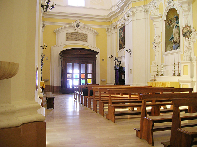 Alla chiesa trecentesca appartengono sicuramente il prospetto principale e la parte bassa del lato destro fino alla cornice marcapiano; sono tuttavia evidenti tracce di interventi successivi, come la sostituzione dell'oculo della facciata con il finestrone rettangolare e la chiusura delle strette monofore e del portale sul lato destro dell'edificio, necessaria per scandire ed articolare la decorazione barocca dell'interno. Il ricco portale principale, caratterizzato dalla esuberante lavorazione dell'archivolto, degli stipiti a fasce di colonne alternativamente lisce, a spina di pesce e a tortiglione, e dei capitelli a fogliame ricurvo, si attribuisce alla scuola trecentesca di Nicola Mancino, mentre il portale laterale, opera di maestranze locali, proviene da Santa Maria Maggiore, da dove รจ stato trasferito nel 1884. L'interno della chiesa mostra la piena adesione ai canoni architettonici e decorativi del barocco; la fastosa e ricercata ornamentazione scandisce lo spazio, amplia e dilata i volumi (anche grazie alla vistosa sopraelevazione, necessaria per realizzare la volta), restituisce luce e colore. Ai lati dell'ingresso si fronteggiano due confessionali in legno scolpito del XVII secolo, mentre sulla controfacciata, sotto lo stemma francescano, una lunga iscrizione in latino ricorda le vicissitudini storiche del monumento. Gli altaroni laterali in stucco, alternati a lesene e paraste, incorniciano dipinti e statue lignee: degni di nota sono, sulla parete sinistra, la tela che raffigura una Madonna con Bambino e Santi (1604), commissionata dalla nobile famiglia De Sorte, e un Annunciazione tardocinquecentesca, in cui compare lo stemma della famiglia Farina. Altre due tele, raffiguranti rispettivamente la Vergine e Santa Lucia, ornano la parete destra insieme alla settecentesca scultura lignea, dorata e dipinta, raffigurante Sant'Antonio da Padova con angeli.