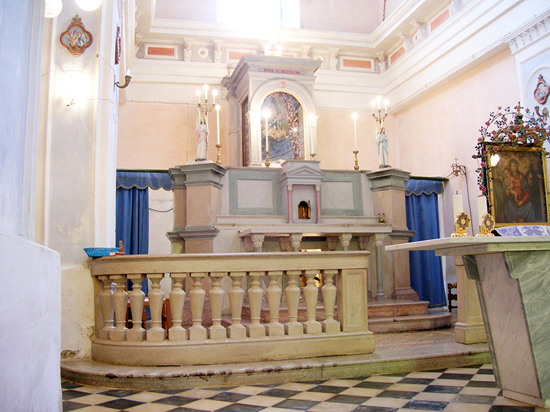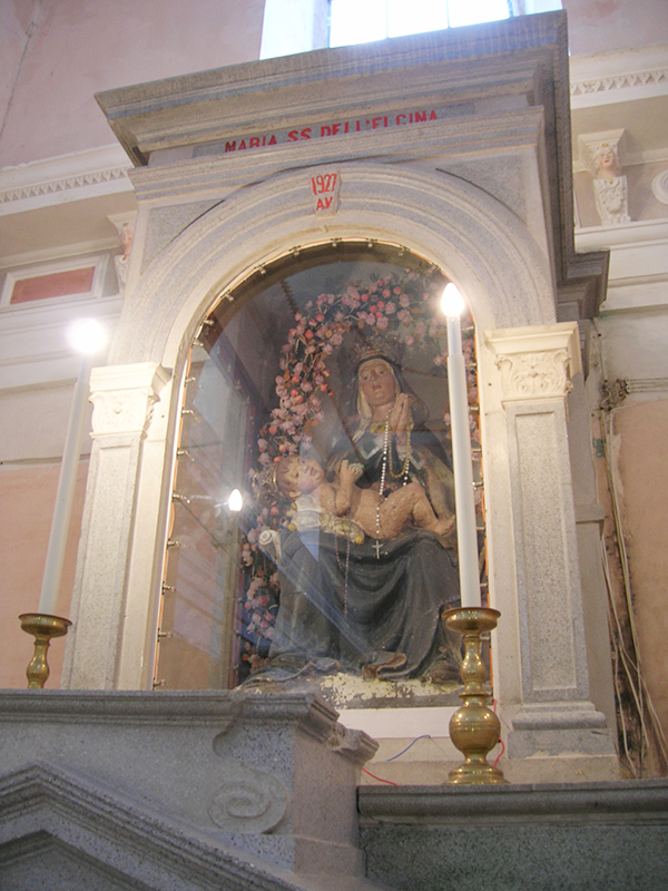 Sorge su una collina rocciosa a breve distanza dal centro storico del paese. La chiesa, nella sua fattezza attuale, in pietra locale, è di recente costruzione, ma di antica fondazione e riveste un notevole valore storico-artistico-religioso per tutta la vallata. La tradizione vuole che un giorno due pastorelli muti di Abbateggio, pascolando le pecore sulla collina dell'Elcina, videro su di un albero di elce (leccio) una Signora e, ai piedi dell'albero, un quadro che rappresentava la Madonna seduta su un albero con in braccio Gesù Bambino. La Signora disse ai pastorelli di desiderare una Chiesa su quel colle, ripetendo per tre volte la medesima richiesta. Il 9 ottobre 1927 il reverendissimo Monsignor Don Domenico Coia, per delegazione dell'Arcivescovo di Chieti, benedisse l'altare maggiore sul quale, entro una particolare edicola, è situata la statua della Madonna dell'Elcina in terracotta tinteggiata. Sotto l'altare vi è situato un tronco di elce che si addita come un resto dell'antico albero sul quale apparve la Vergine, mentre presso l'altare, sul lato sinistro, vi è situato un quadro dipinto ad olio su tela rappresentante la Madonna che, in tunica rossa e manto azzurro, seduta su di un albero, sostiene fra le braccia il Bambino ignudo e benedicente.