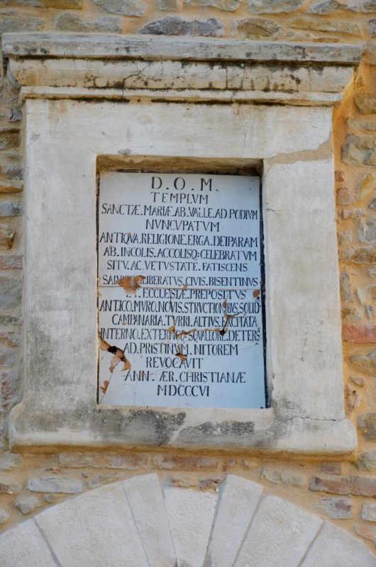 Di origine quattrocentesca ma completamente restaurata nel 1806, dell’antico impianto gotico oggi conserva solo una monofora in pietra ad archetto trilobo e stemma nella chiave dell’arco. La costruzione ha copertura a capanna e sul lato che confina con il cimitero si appoggia una robusta torre campanaria a pianta quadrata. L’ingresso laterale presenta un arco gotico incorniciato in pietra, al di sopra del quale in una nicchia è un’epigrafe su lapide in cui si legge “D(eo) O(ptimo) M(aximo) Templum Sanctae Mariae ab Valle ad Podium nuncupatum antiqua religione erga Deiparam ab incolis accolisq(ue): celebratum situ ac vetustate fatiscens Salvat(or) Liberatus civis Bisentinus et ecclesiae prepositus antico muro novia structionibus solidato campanaria tussi altius excitata interno externoq(ue) squallore deterso ad pristinum nitorem revocavit ann(o) aer(ae) christianae MDCCCVI”. Poco distante da questa è un’altra lapide su cui è scritto “Dopnn(us) Micutius de Monte Regali prepositus i(n) ecc(lesia) f(ieri) f(ecit) hoc op(us) 1487”. L’ingresso principale invece è costituito da un semplice portale ad architrave piano sormontato da un finestrone rotondo. L’interno è ad aula unica con copertura di capriate lignee a vista.