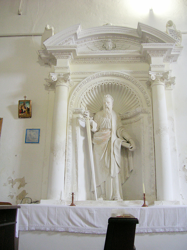 Si tratta di una chiesa rurale di cui non si conosce la data di costruzione ma certamente già esistente nel 1500, perché citata in molti documenti assieme a quella di San Rocco. L'edificio si presenta con una facciata semplice, unico ingresso con portale in pietra, finestre laterali e bucatura centrale quadrangolare. Internamente lo spazio rettangolare si articola in una sola navata con copertura a capriate. Le pareti laterali sono arricchite dalla presenza di due altari, uno per lato, riccamente decorati e recanti le statue di San Pietro del 1628 e di San Paolo del 1627. Nell'altare centrale, addossato alla parete di fondo, i fastosi decori incorniciano un affresco in cui è ritratta la Madonna col Bambino e San Pantaleone.
