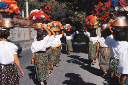 La contrada di Santa Cecilia il 16 agosto scende in paese con una variopinta processione di donne con conche e canestri colmi di grano per onorare San Rocco e ringraziarlo del raccolto appena concluso.