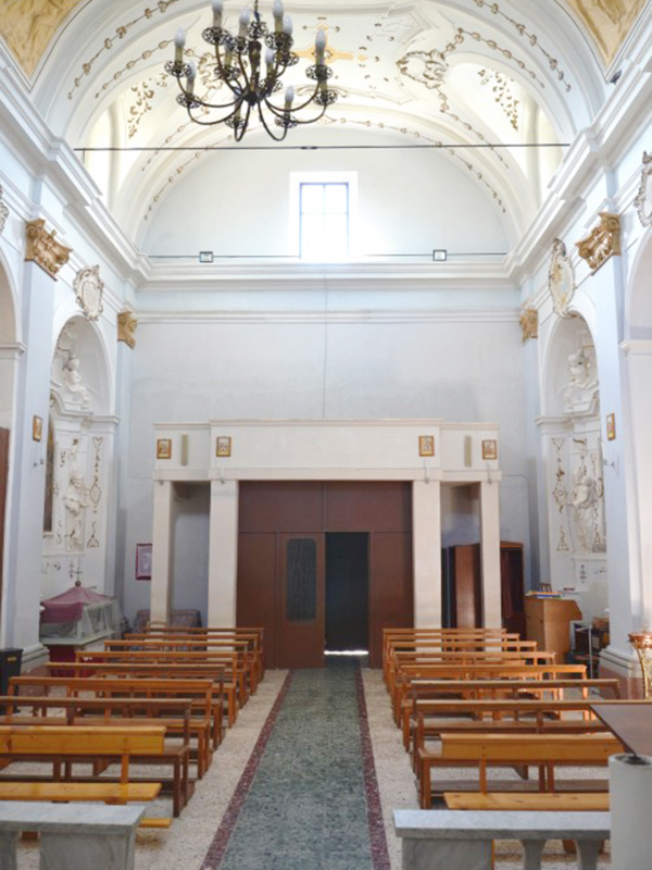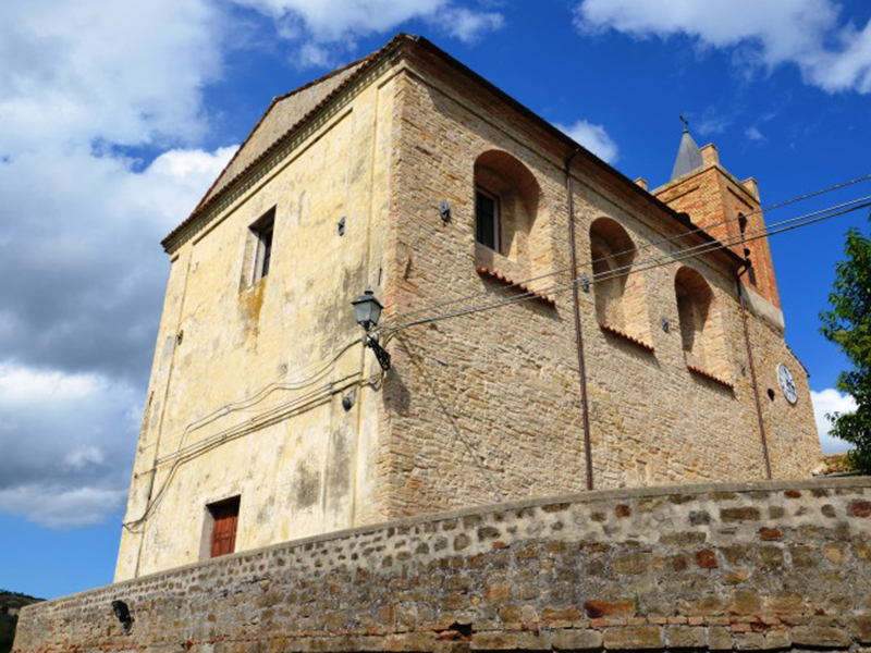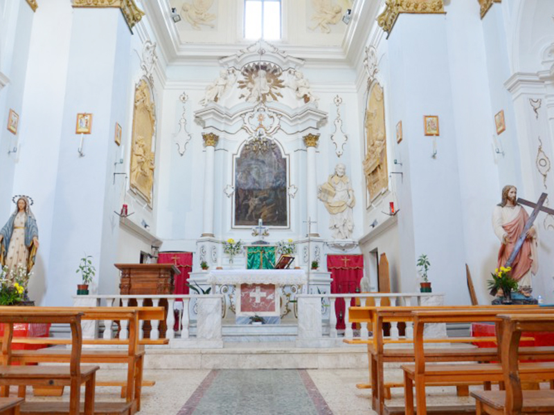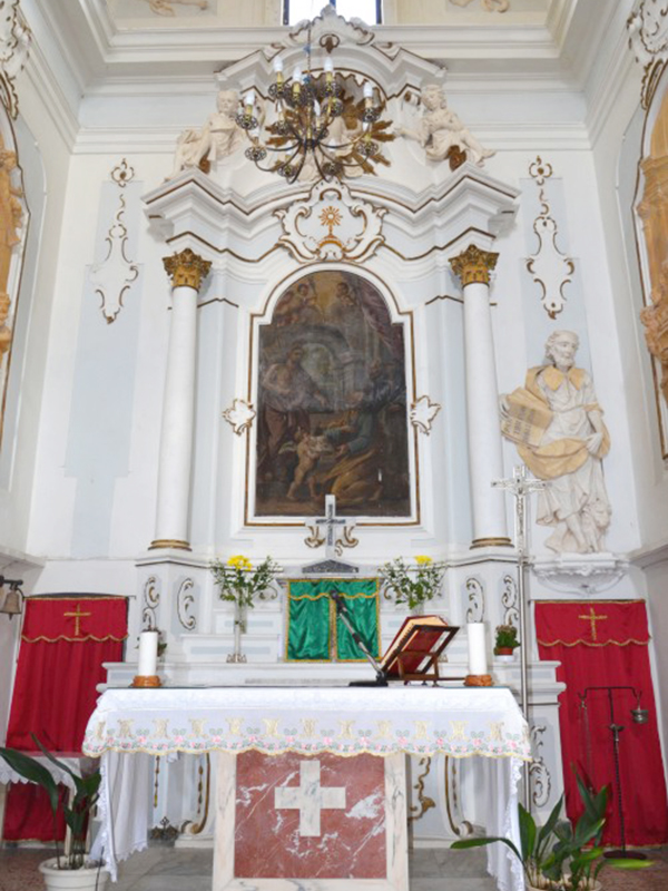 Eretta nel XII secolo, è stata ricostruita negli anni tra il 1735 ed il 1780, soprattutto con il contributo economico della famiglia Pincelli. Ha copertura a capanna e sulla semplice facciata a coronamento orizzontale si aprono un portale ad architrave piano e, più in alto, una finestra rettangolare. L’antico portale è stato rimesso in opera sul fianco destro dell’edificio; sul suo architrave è inciso “Hoc opus fecit fieri Angelus Pincelli” e lì accanto è rimessa in opera una mattonella che reca la data 1571. Al di sopra del portale è un rilievo raffigurante S.Pietro e su di esso si legge la data 1735. Su ognuno dei lati lunghi della chiesa si aprono tre finestre con profonde strombature e nella parete posteriore si innesta una torre campanaria a base quadrata che termina con una guglia. L’interno, a vano unico, si presenta in veste settecentesca, con 5 altari lungo le pareti. Questi sono dedicati alla S.Croce, alla Madonna del Rosario, a S.Carlo Borromeo, alle Anime Sante (o Suffragio) e a S.Filippo Neri.