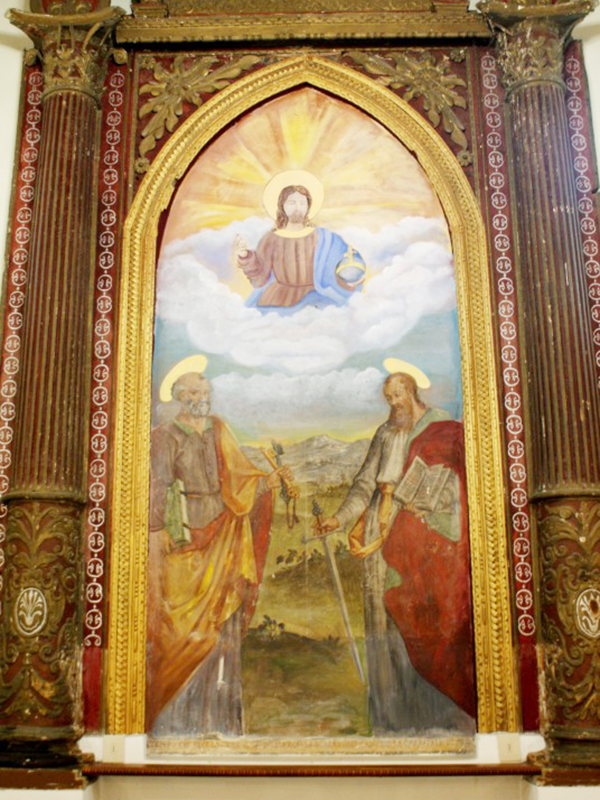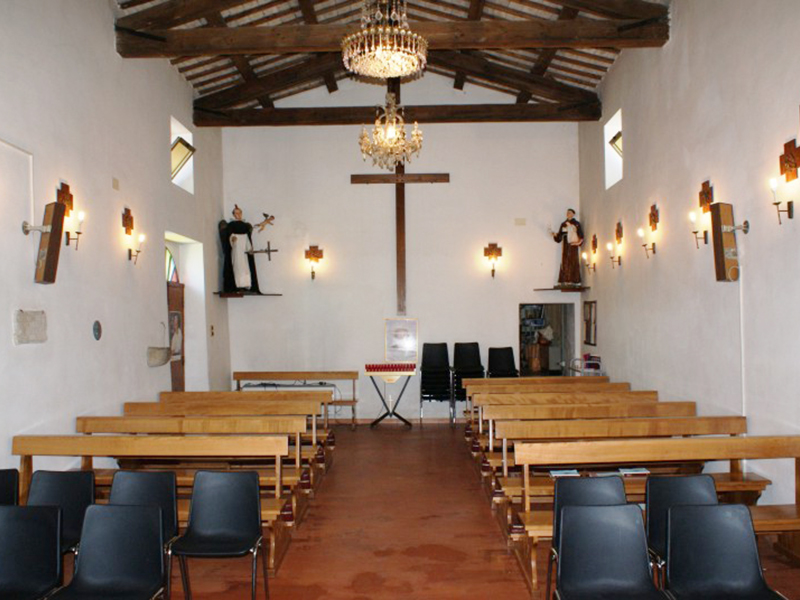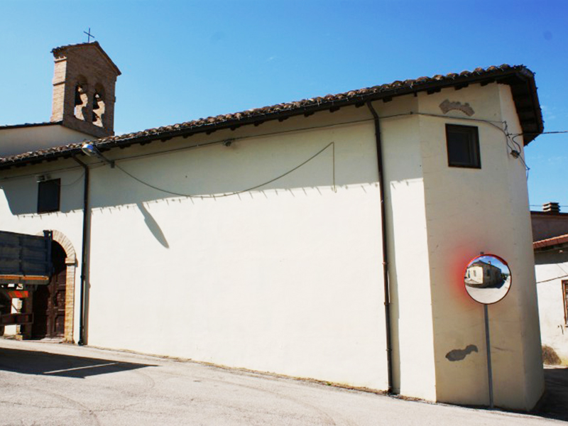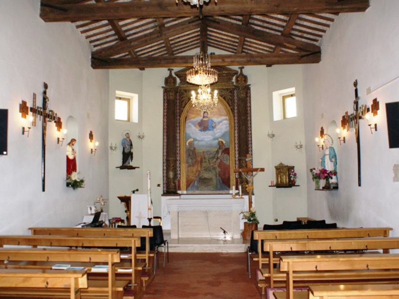 La chiesa, citata per la prima volta in documenti nel 1386 ed oggi completamente ristrutturata, si presenta con copertura a capanna ed ingresso laterale. In corrispondenza della parete contrapposta all’altare si erge un campanile a vela che ospita due campane. Sulla parete esterna dell’abside è stato rimesso in opera un frammento di pietra lavorata appartenuta ad un edificio preesistente. L’interno è a navata unica con soffitto costituito da capriate a vista. Nell’abside, rialzato di un gradino rispetto al resto, trova posto un semplice altare. Sulla parete posteriore, in una coreografia rinascimentale, fa bella mostra di sè una pala d’altare in cui campeggia la figura di Gesù ai cui piedi San Pietro porge le chiavi. In prossimità dell’acquasantiera è apposto un frammento di travertino con una scritta latina che reca in testa il simbolo dei Gesuiti, sempre molto presenti in queste zone. Poco distante, incastonata nel muro, si trova la placca con la Croce delle Indulgenze concessa da Papa Leone XIII nel 1901. Sulla parte centrale di questa si legge “Iesus Christus Deus Homo Vivit Regnat Imperat MCMI” e nel cerchio esterno "Osculantibus crucem hanc in ecclesia positam et recitantibus Pater indulgentia 200 dierum semel in diem".