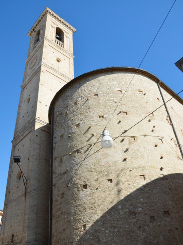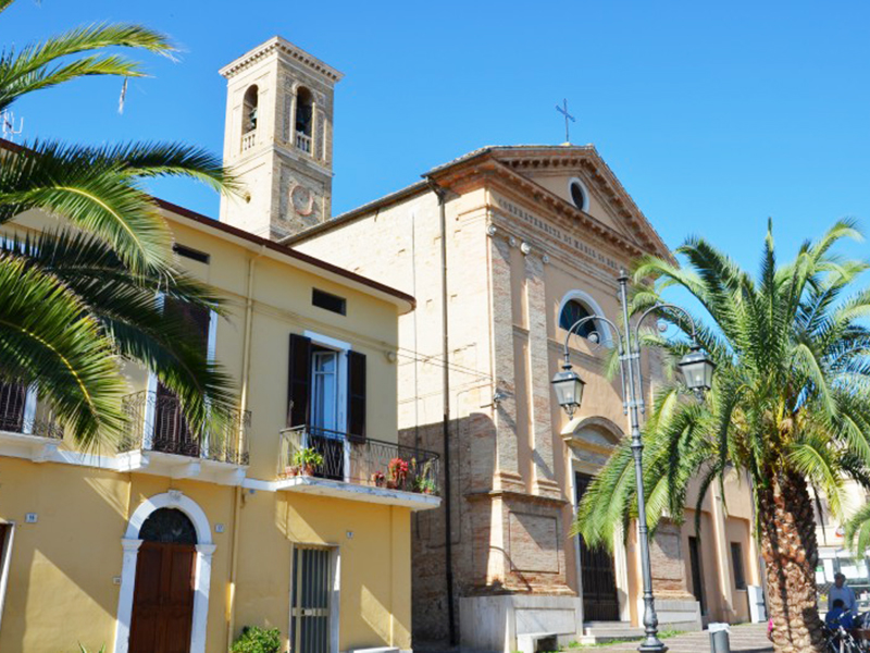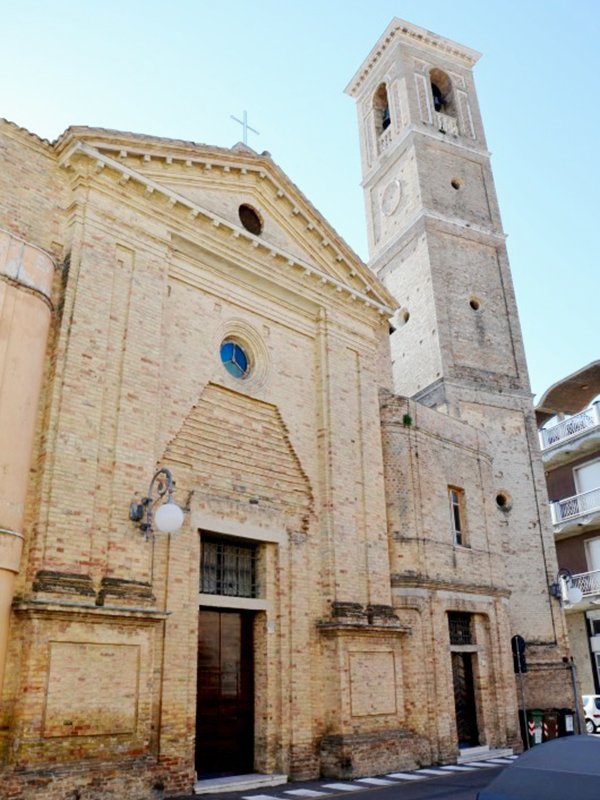 Venne eretta nel 1676 e l’aspetto di oggi è quello della ristrutturazione ottocentesca. E’ caratterizzata soprattutto dall’avere due facciate, distanti ma perpendicolari tra di loro, ed entrambe sembrano quella principale. Ha copertura a capanna ed entrambe le facciate terminano con un timpano. Il portale che dà sulla piazza è incorniciato in pietra ed è sormontato da una lunetta; il finestrone soprastante è semicircolare e la facciata è aggraziata da lesene. Alla parete posteriore, in corrispondenza dell’abside, si affianca la torre campanaria a base quadrangolare e sommità piana.