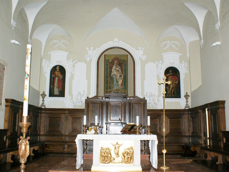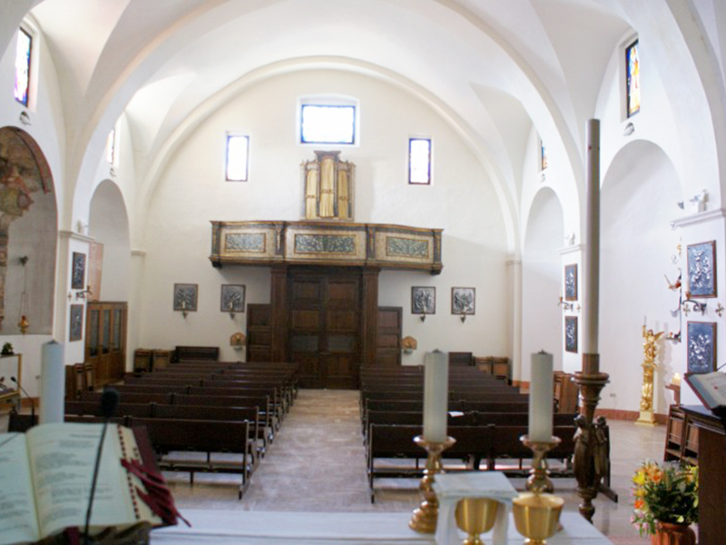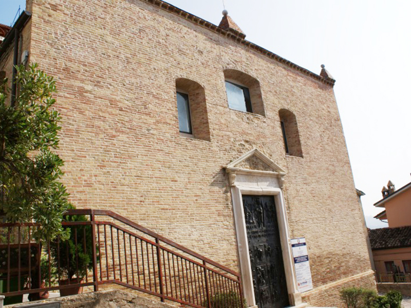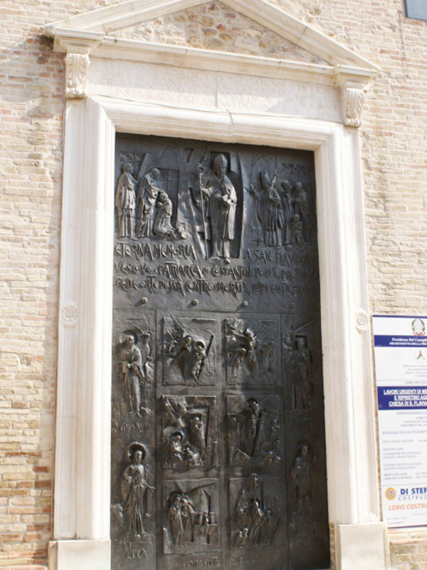 Citata in documenti dell’XI secolo, la costruzione che oggi vediamo è un rifacimento del XVI secolo, quando il paese apparteneva ad Andrea Matteo Acquaviva, Duca di Atri e Conte di San Flaviano (l’attuale Giulianova). La copertura è a capanna, un campanile a vela in corrispondenza della facciata posteriore sorregge due campane e la sua facciata in laterizio, a coronamento orizzontale, è sormontata da tre pinnacoli a piramide. Vi si apre un portale ad architrave piano incorniciato in pietra bianca e sormontato da un timpano sorretto da due mensole decorate con foglie d’acanto. Sull’architrave si legge “Ore tuo Xpe benedictus sit locus iste / pax sit intranti benedictio quoque moranti / sacrum hoc divo Flaviano dicatum publico aere / instauratum est anno Domini 15LXXXII”, dove la data è 1582 e Xpe sta per Christe. Le pesanti porte in bronzo, recanti figure a rilievo celebrative di San Flaviano e di episodi evangelici, sono state apposte in occasione dell’Anno Santo 2000. Al di sopra del portale si aprono tre grandi finestre a mezzo sesto, fortemente strombate. L’interno, ad aula unica, vede il presbiterio separato dal resto da un grande arco a tutto sesto. Sulla sua parete destra è incastonata al muro una lapide funeraria di inizio Settecento su cui sono incise le celebrazioni di due membri dell’insigne famiglia dei Caracciolo. Su una delle cappelline votive laterali, nonostante un frettoloso restauro negli anni Ottanta del secolo scorso abbia occultato diverse altre testimonianze, si possono ancora ammirare alcuni affreschi rappresentanti una Crocefissione, probabilmente anch’essi di fine Cinquecento. Sempre dello stesso periodo sono il fonte battesimale e le due tele che raffigurano S.Flaviano e S.Rocco.