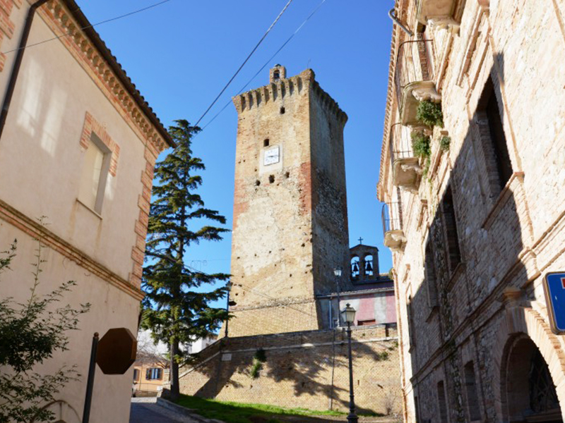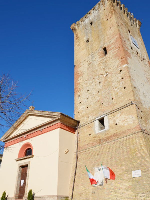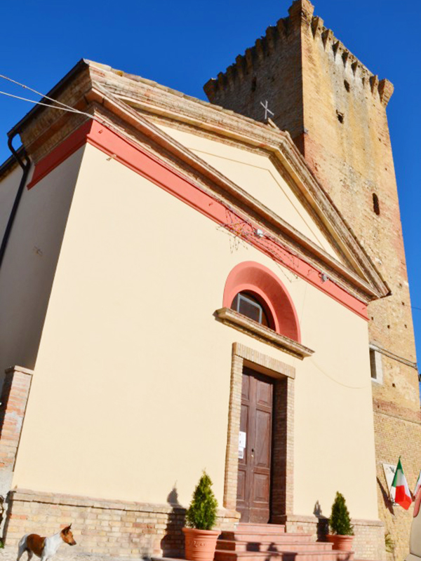 Si tratta di un edificio costruito nel 1883 in sostituzione dell’antica Chiesa di S.Silvestro che sorgeva appena più ad ovest, nei pressi dell’attuale belvedere. Ha copertura a capanna ed in facciata si apre un semplice portale ad architrave piano incorniciato in laterizio, sormontato da un grande oculo semicircolare. All’ingresso del borgo ci si imbatte nel possente Palazzo Saliceti, proprietà della famiglia materna e luogo di nascita del giureconsulto e patriota Aurelio Saliceti (1804–1862), mentre nella parte Nord sopravvive tra le case un torrione rotondo in pietra appartenuto alle antiche fortificazioni.