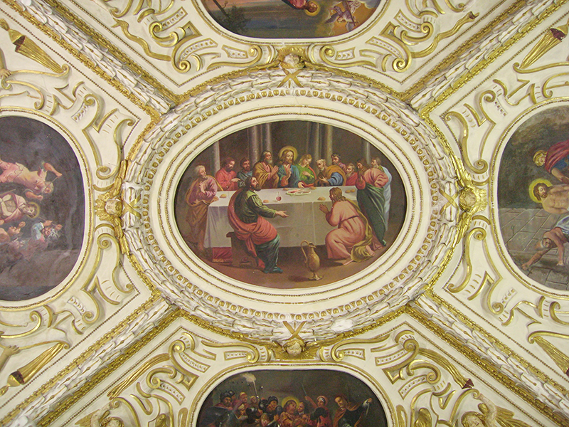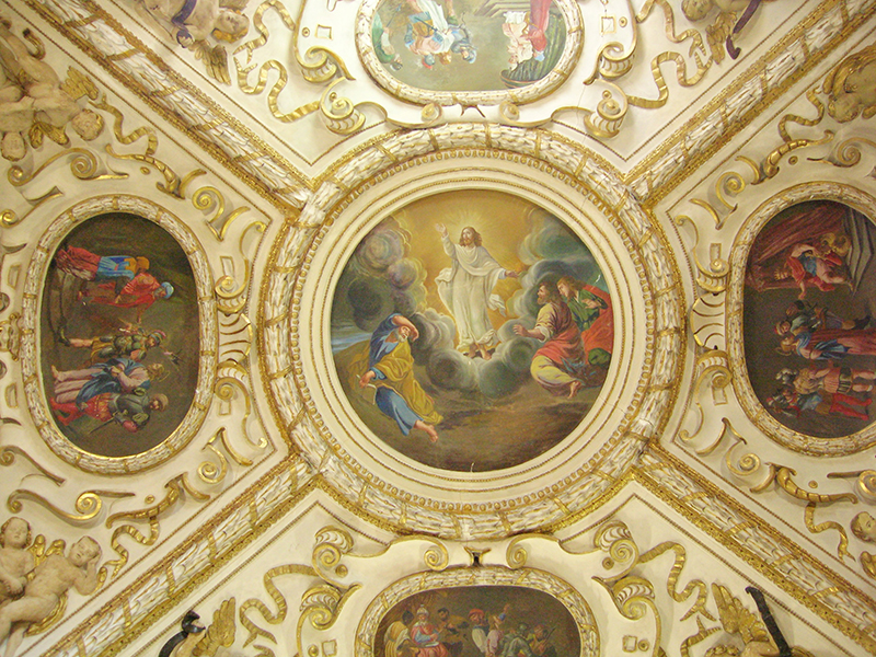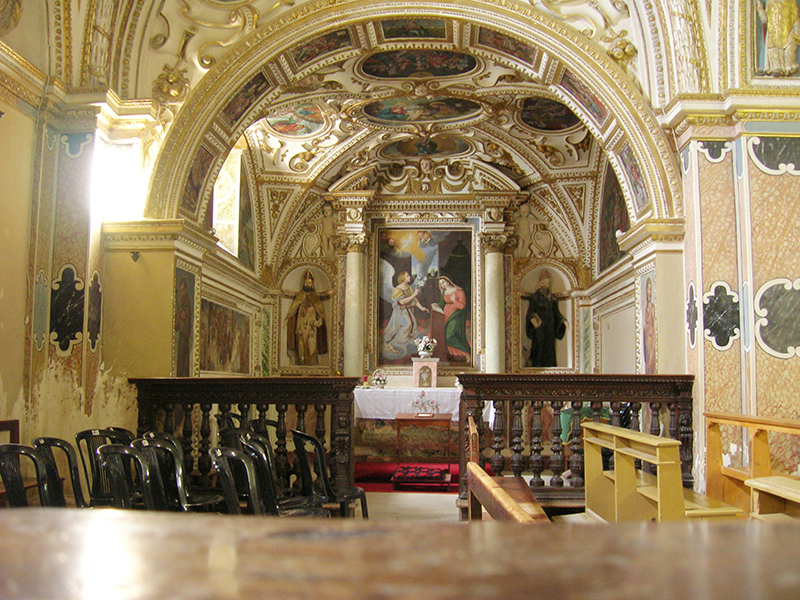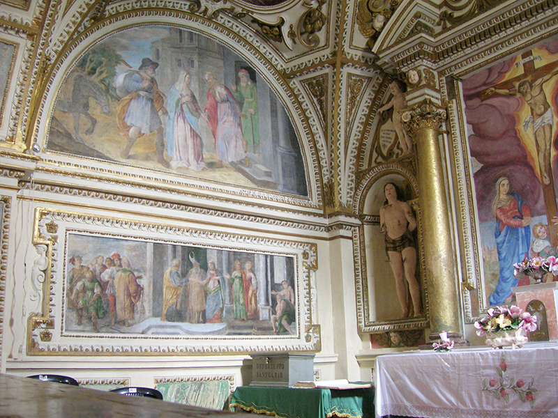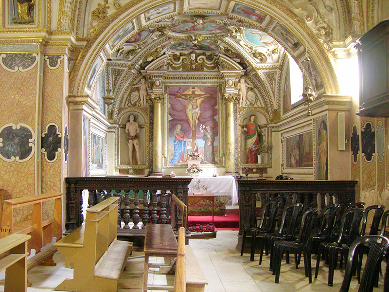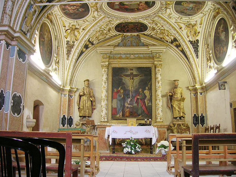 L'oratorio di Santa Maria della Croce, posto ad appena 2 Km a valle del centro abitato, sorge su un colle che sovrasta il versante nord dell'alta valle del Pescara. Gli studiosi di storia dell'arte la definiscono come "un piccolo gioiello barocco" e come "quanto di più perfetto ha il barocco italiano come intaglio, architettura e pittura". Fu edificata il 25 marzo del 1613, a ricordo dell'apparizione della Vergine ad un pastorello del luogo di nome Domenico Del Biondo. La chiesa ha una facciata sobria, essenziale e senza ornamenti di rilievo, costituita di grossi blocchi di pietra locale. Al centro del frontone si apre una finestra di forma quadrata posta al di sopra dell'unico portale della Cappella primaria sorretto da appositi stipiti decorati da mensole a fioroni. L'interno della chiesa, che ha una struttura a tre braccia, è costituito da una navata centrale e due Cappellini laterali: quella a sinistra è dedicata all'Annunziata, mentre quella di destra a Santa Maria della Croce. Al visitatore che varca la soglia della chiesa si presenta un interno talmente ricco, che non avrebbe di certo immaginato dalla facciata esterna austera e semplice. E' all'interno che il barocco esprime la sua sontuosità; si possono ammirare stucchi e dorature, fregi ed espressioni, finti marmi e tele, pitture al guazzo e tempera, che ornano tutte le pareti interne. La navata e le cappelle laterali presentano stucchi e decorazioni a pittura che descrivono ben 55 scene e ritratti suddivisi in tre cicli pittorici dovute alla mano di altrettanti pittori.